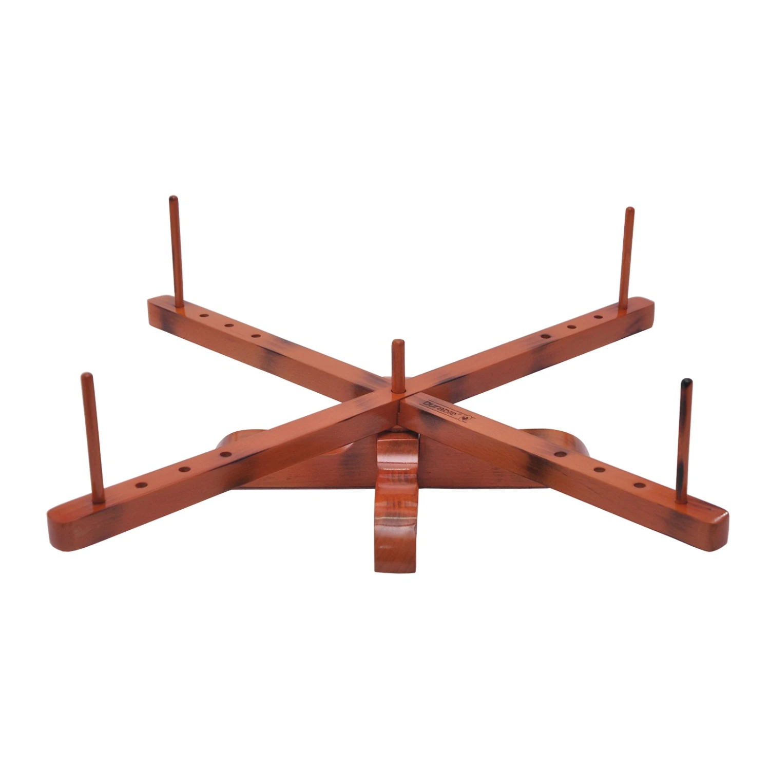 This swift has movable arms that can be adjusted to suit the size of the skein you need to hold. The base stays in position and the top section turns to allow you to wind your yarn.