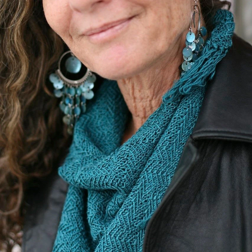 The smooth, solid weight of this silk yarn adds a rich luxurious feel to this bandana. Knit from corner to corner in one piece, the zig zag slip stitch pattern is a pleasure to knit.