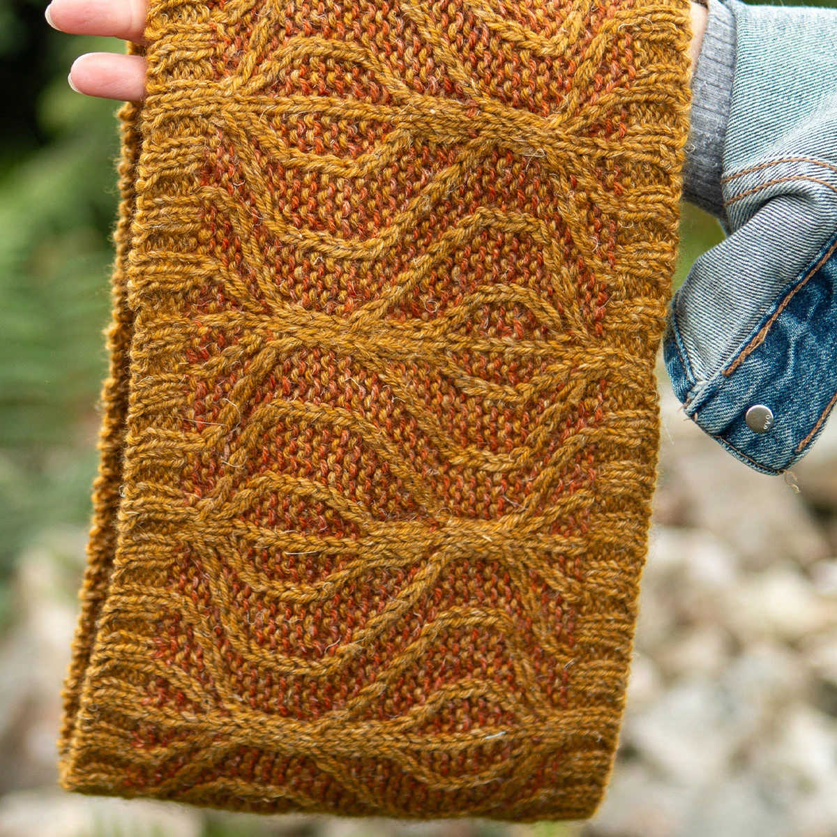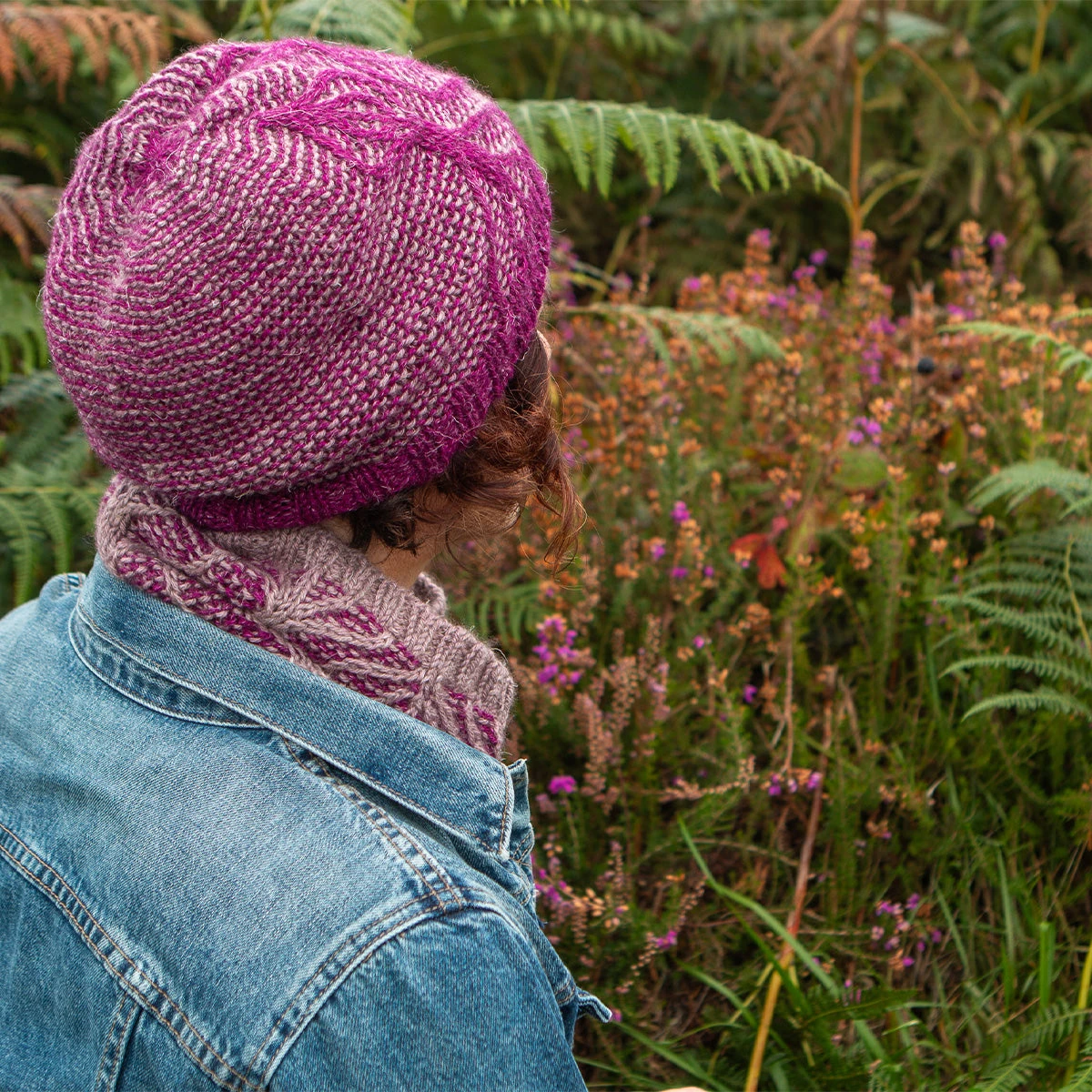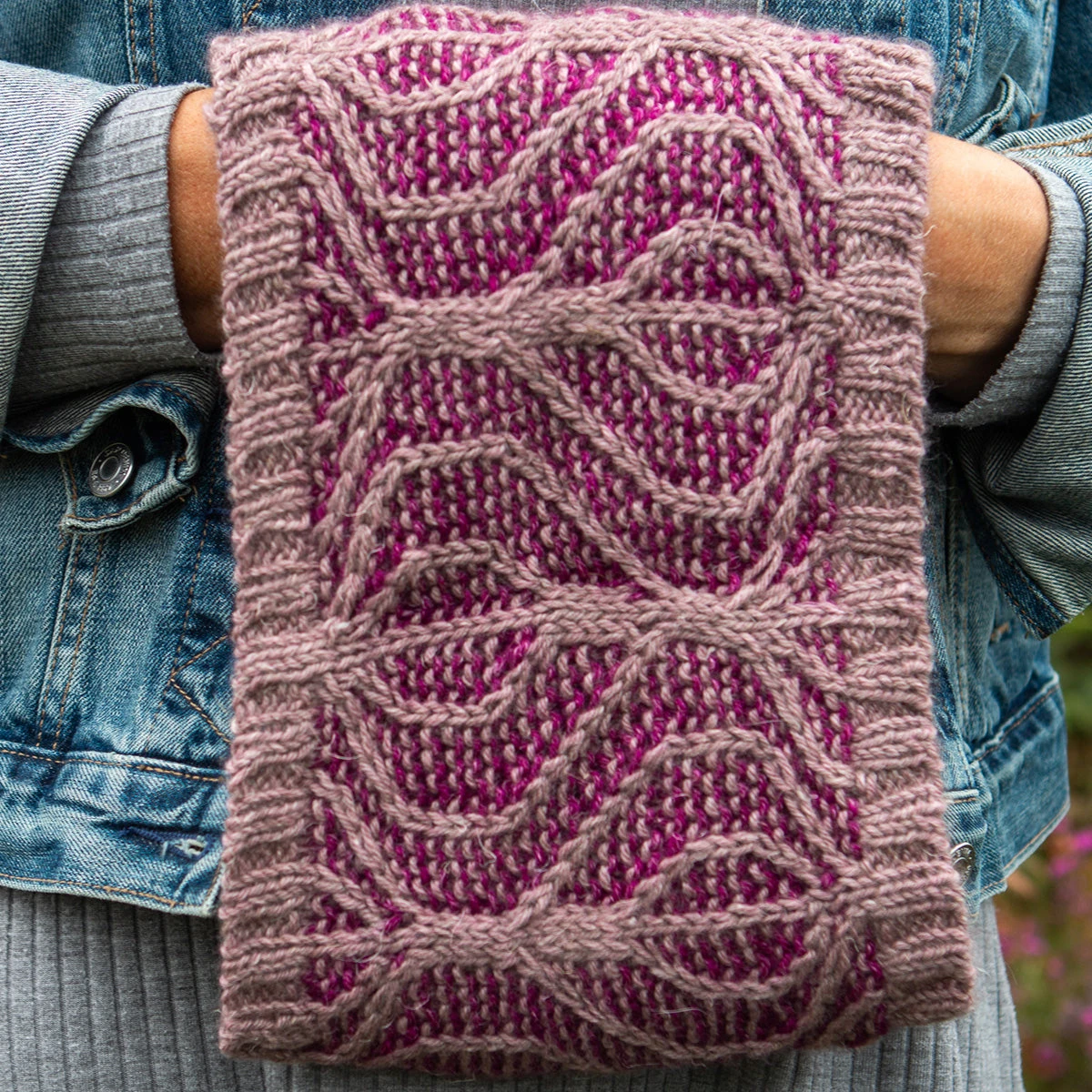 Join us as we dive into the world of bold motifs and travelling stitches. These single-column stitches weave back and forth across a background of striped garter stitch.