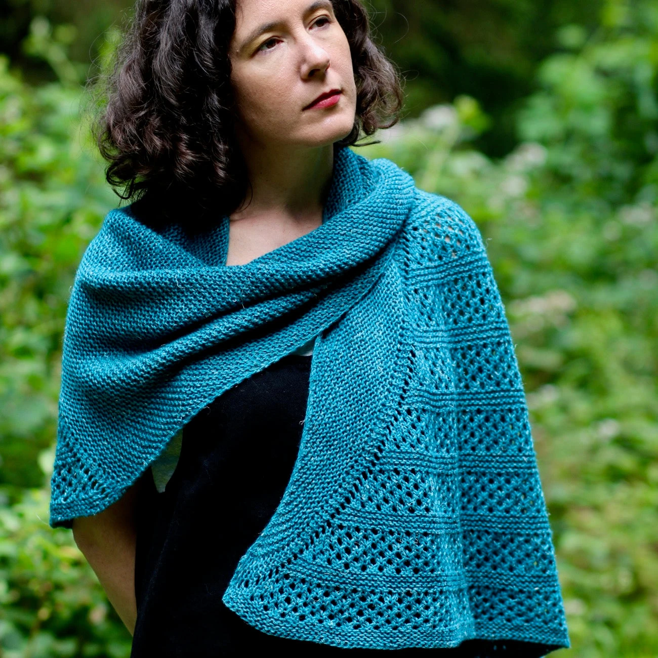 Worked in two directions this shawl creates a wide biased shape with wonderful long wings that are perfect for wrapping around the shoulders. This shawl could also work really well with two colours, alternating the lace and garter stripes.