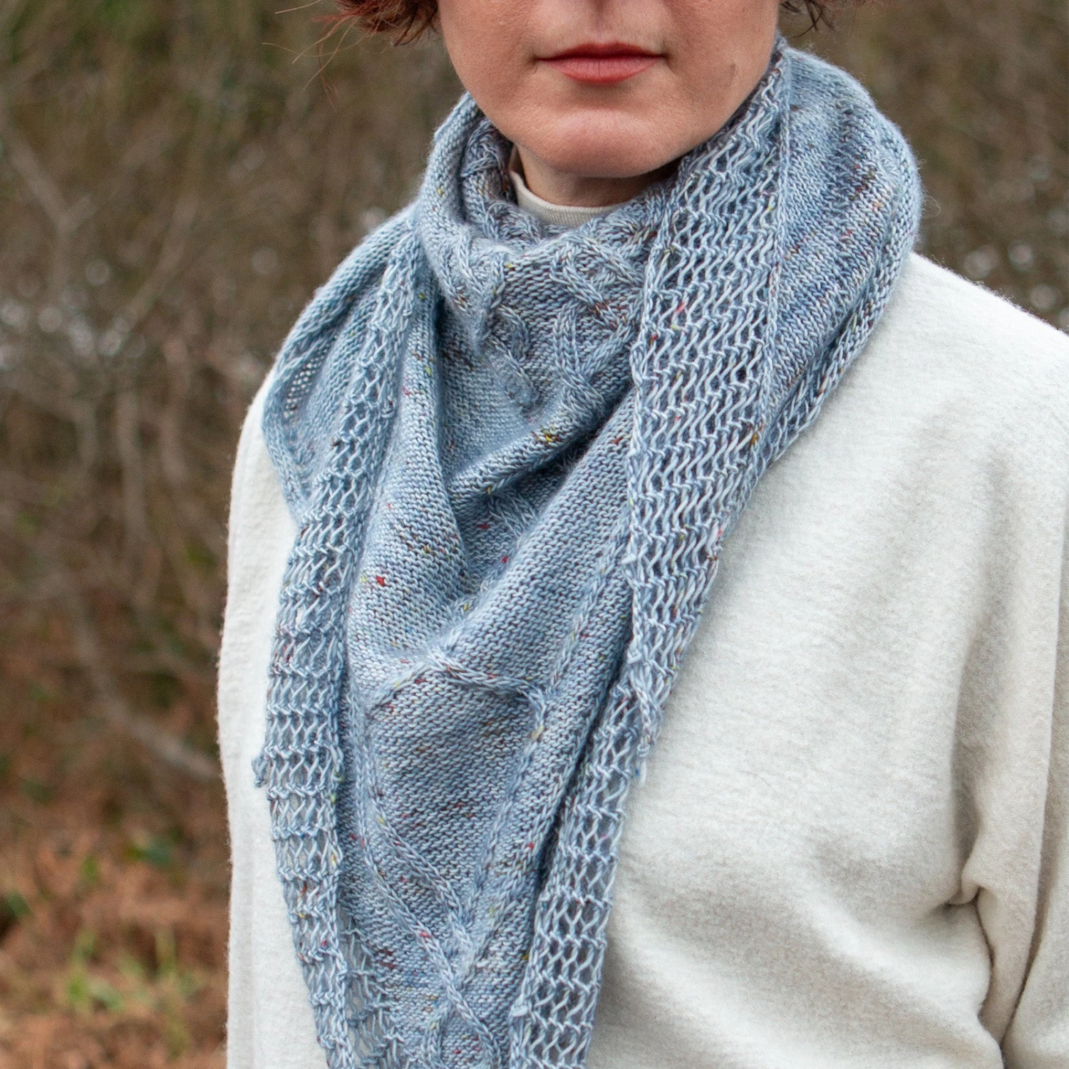 This elegant design features delicate cables in fingering weight yarn, knit from the tip up the cables and lace combine beautifully to create a wearable finished shawl.