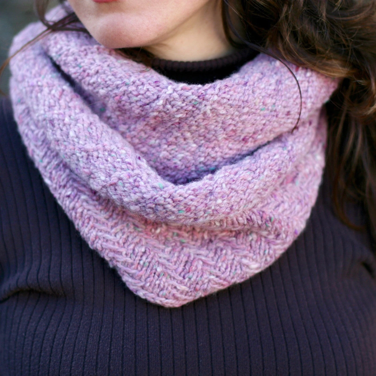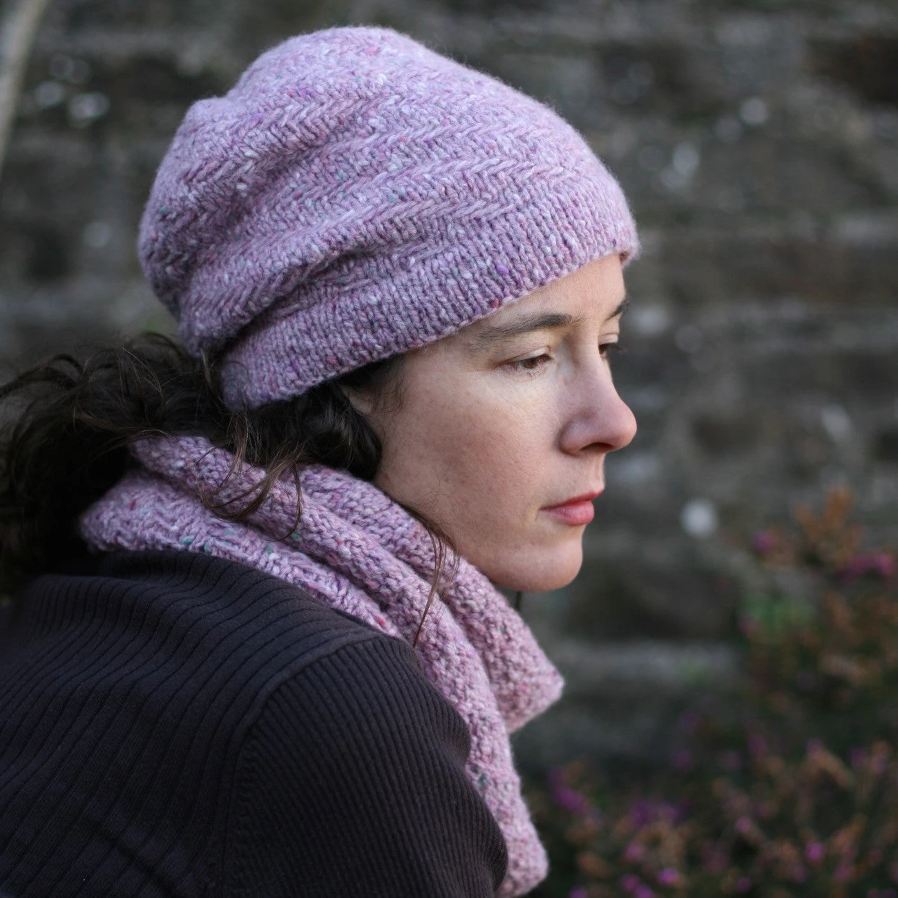 The clean lines of the slip stitch pattern allow the character of the yarn to shine through. Create your perfect hat by knitting to a length that suits you. Shown in a slouchy style; just work less length for a fitted beanie style. The matching eternity cowl is long enough to comfortably be wrapped twice around your neck, the best way to wear a cowl!