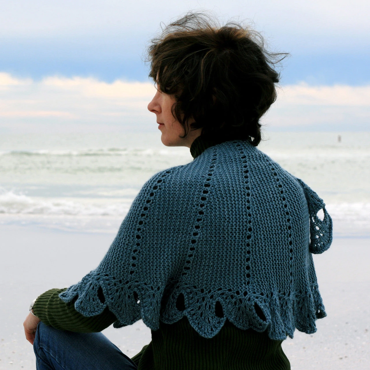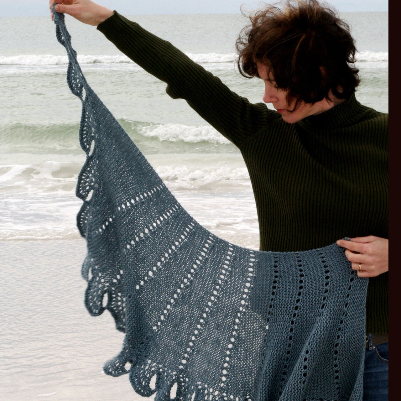 Following the gentle curve of a wave this wrap has a delicate scalloped lace edging. Worked from side to side short row shaping forms a gentle curve and tapers to a tail making it wonderful for staying in place over your shoulder.