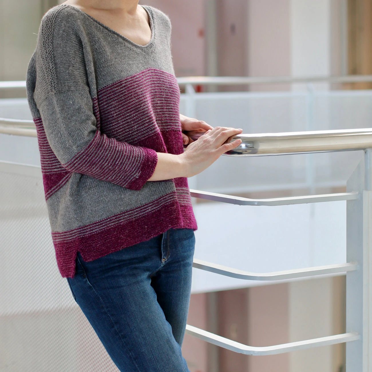 This sweater is a little bit magical; the end product looks complex and difficult to work but it’s an intuitive, fun sweater to knit! This sweater is best knit oversized and allowed to drape on the body. It’s worked in the round from the bottom up, and all the stripes are worked as reverse stockinette helical stripes, which create a seamless join. The different colour panels along the bottom are created using short rows stacked on top of each other.