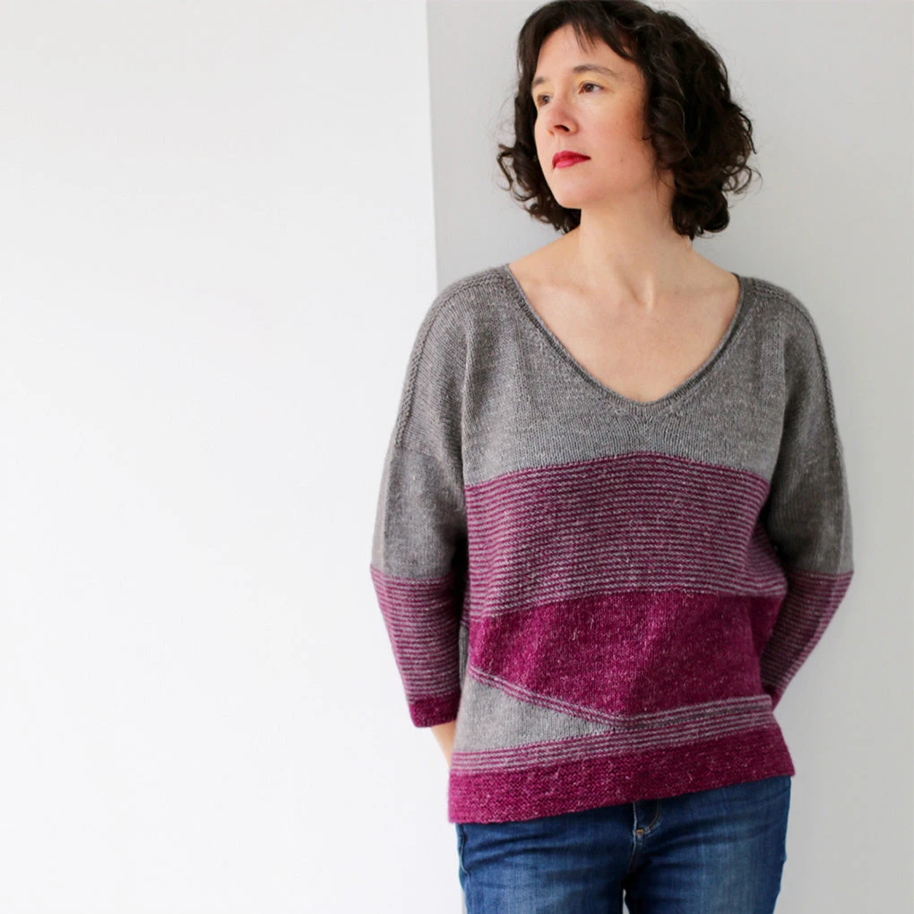 This sweater is a little bit magical; the end product looks complex and difficult to work but it’s an intuitive, fun sweater to knit! This sweater is best knit oversized and allowed to drape on the body. It’s worked in the round from the bottom up and all the stripes are worked as reverse stockinette helical stripes which create a seamless join. The different colour panels along the bottom are created using short rows stacked on top of each other.