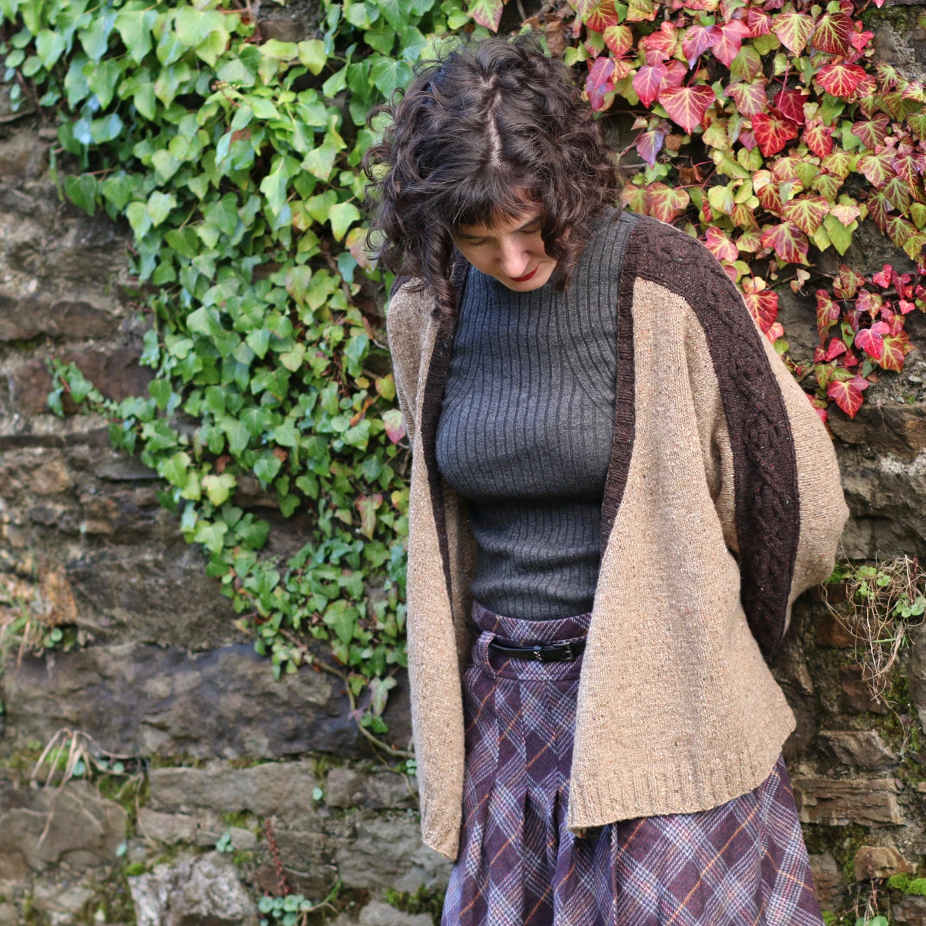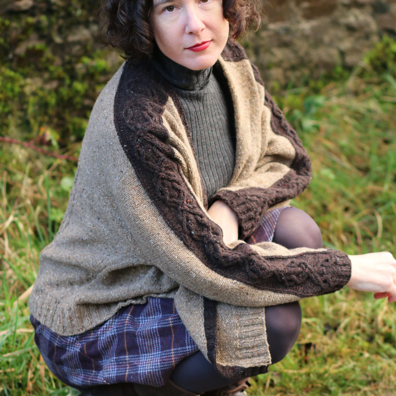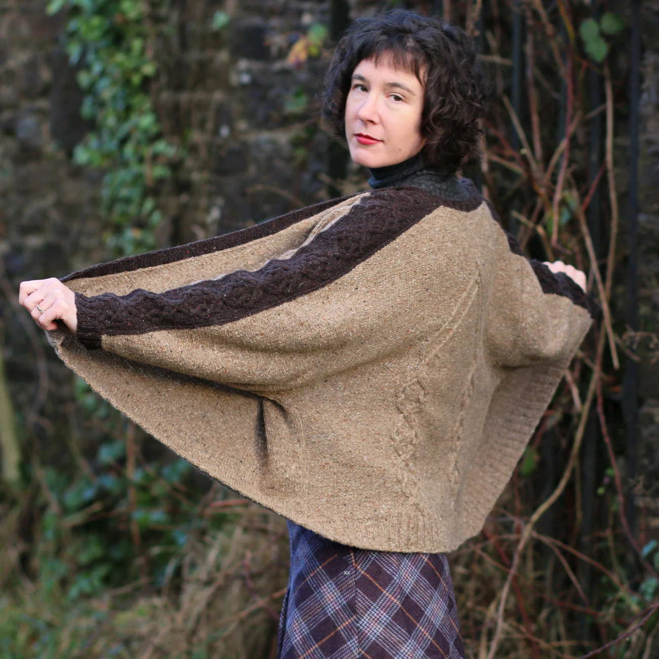 This generously sized wrap is perfect for keeping you cosy on those cool autumn days The diagonal front panels overlap – allow them to flow open for a relaxed look, or close with a shawl pin. The wide batwing sleeves make this a good cardigan to wear as an outer layer.