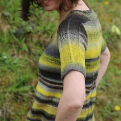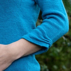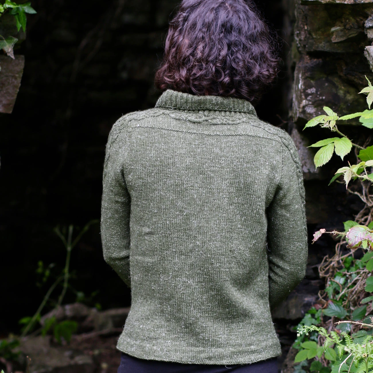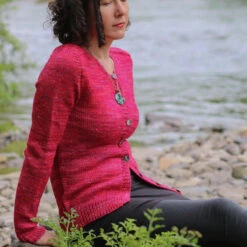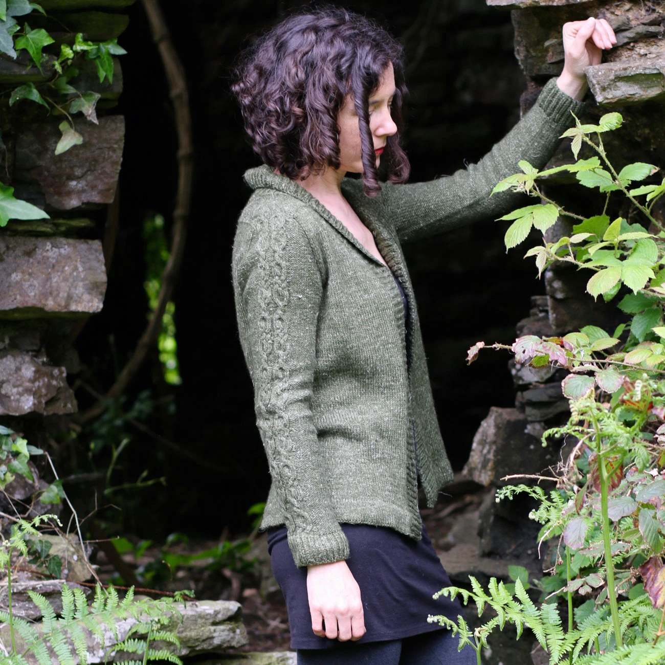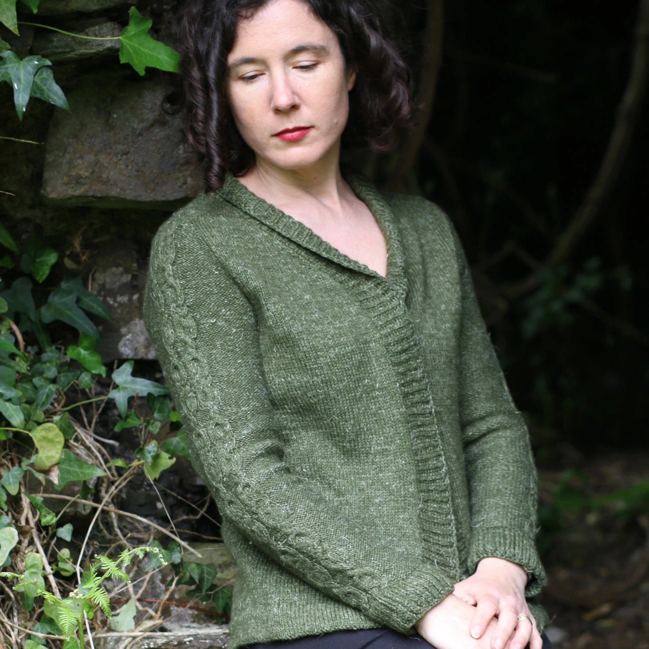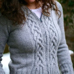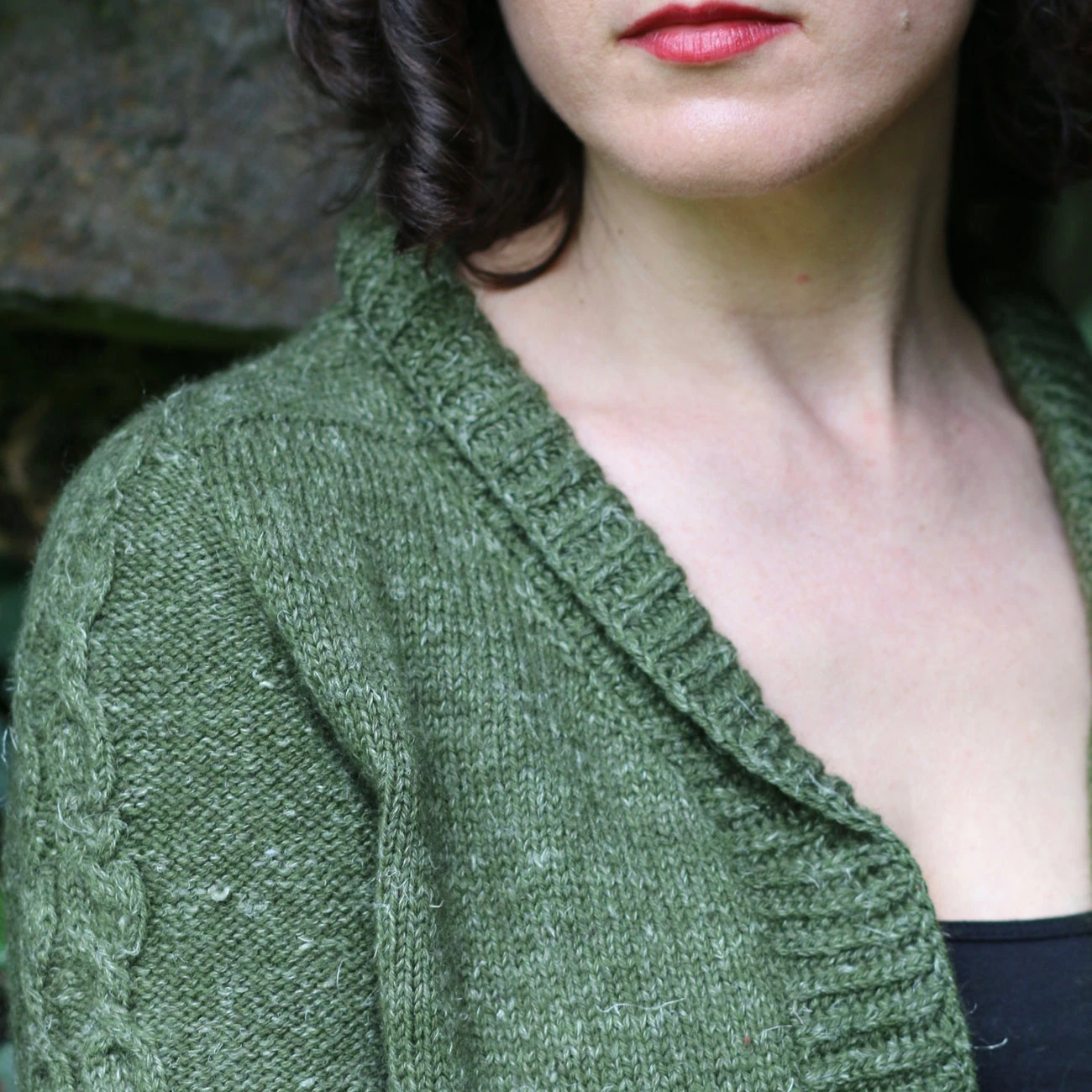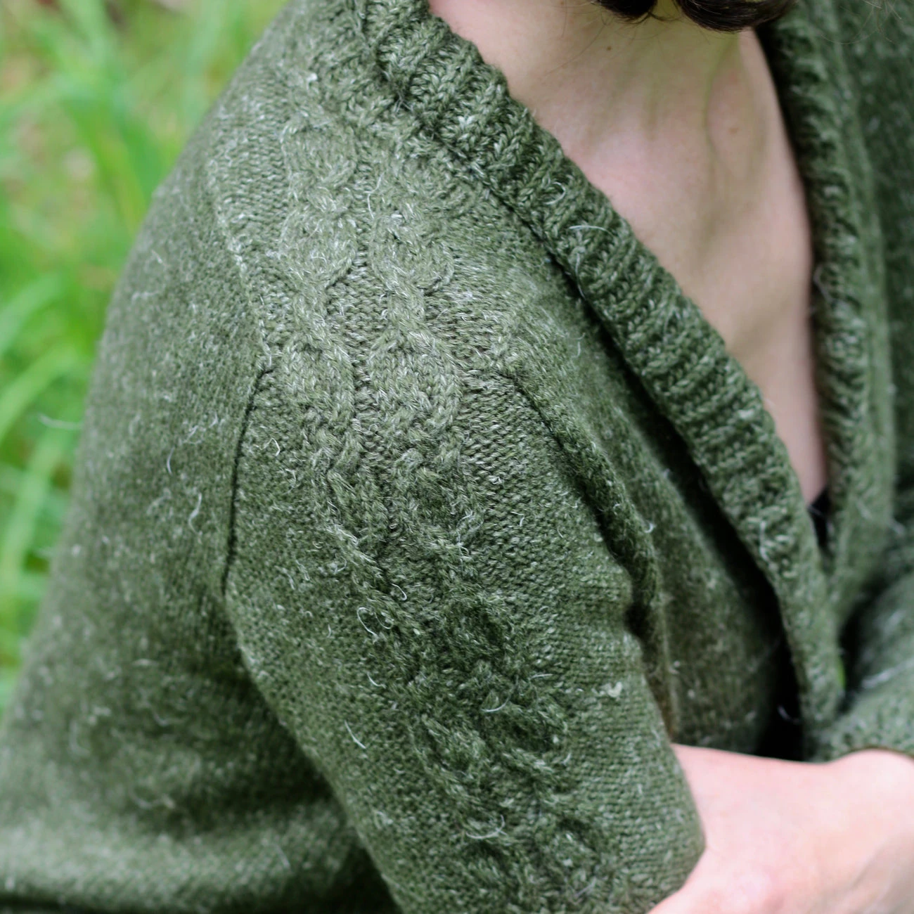 Have fun knitting this cardigan with its unusual construction! Starting at the center of the yoke, each side is worked and then joined in the round to create simultaneous set-in sleeves. The beautiful cables are worked seamlessly from the yoke all the way down to the cuff. The front of the cardigan is finished with a short row brioche shawl collar that can be worn open or pinned closed.