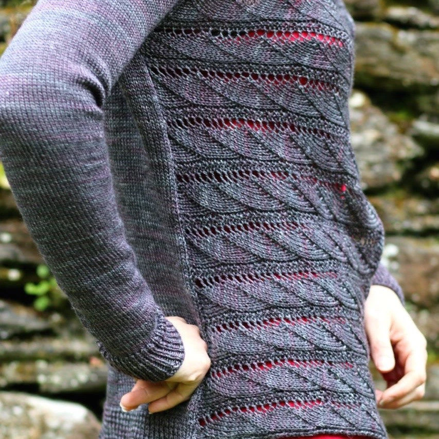 This cardigan is knit from the top down with raglan shoulder shaping. When the back of the body is finished the front scalloped lace panel is worked from picked up stitches along the side. This front panel can be summaryed or allowed to drape down the side.