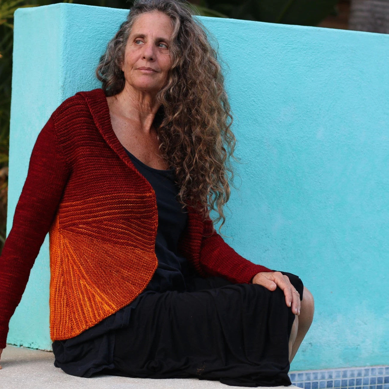This cardigan takes full advantage of the beautiful gradient yarns currently being produced by hand dyers. Worked from the center of the back out the zigzag stitch pattern allows the colors to blend together. The front uses short rows to turn the corner, creating a wonderful curved front and works in garter up to the folding collar. Top down set-in short row sleeves finish the cardigan.