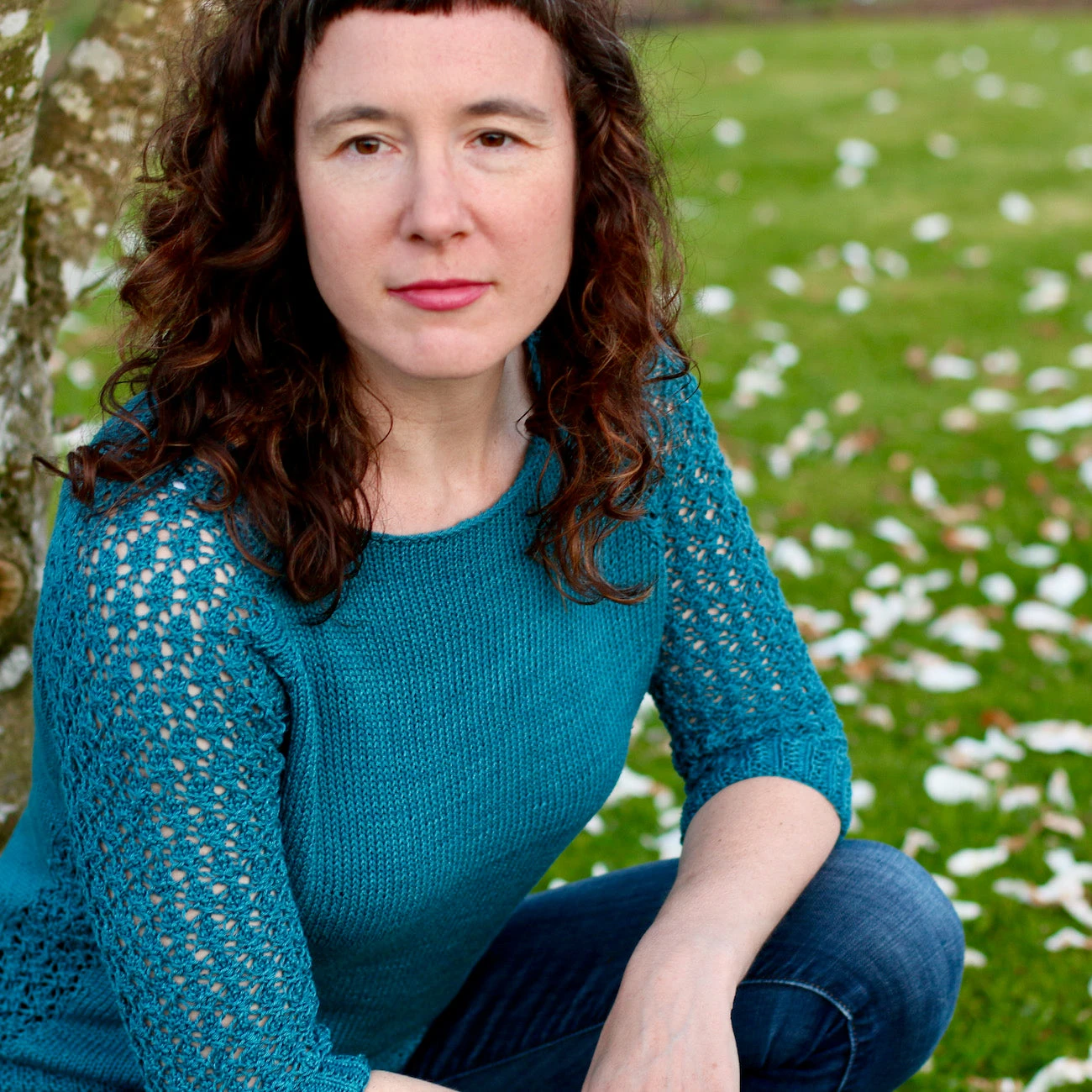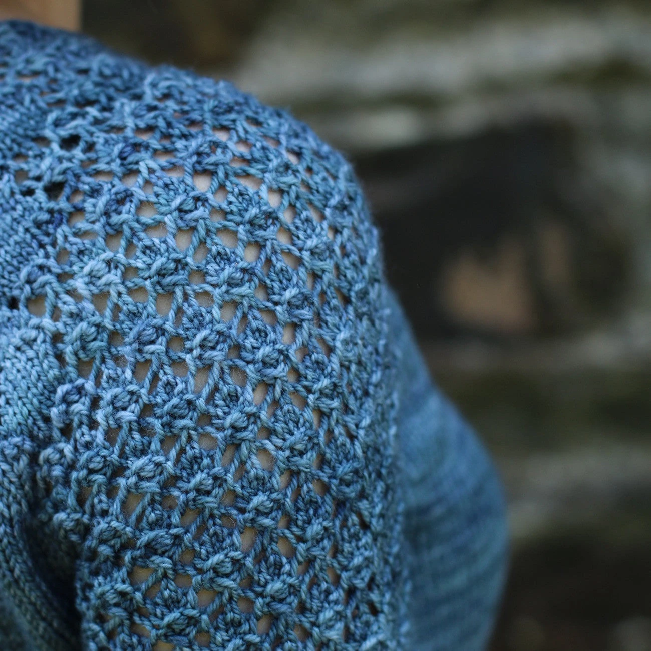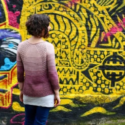Knit from the top down with raglan shaping this sweater has a delicate lace pattern flowing down the sleeves in contrast to the simple knit body. Gentle waist shaping and ¾ length sleeves make this an easy and elegant sweater to wear.
