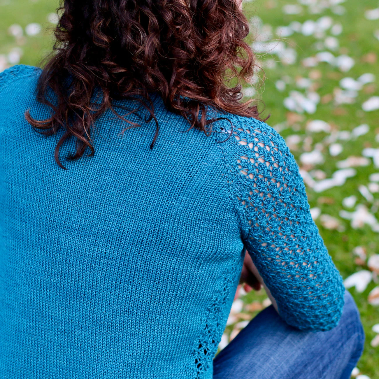 Knit from the top down with raglan shaping this sweater has a delicate lace pattern flowing down the sleeves in contrast to the simple knit body. Gentle waist shaping and ¾ length sleeves make this an easy and elegant sweater to wear.
