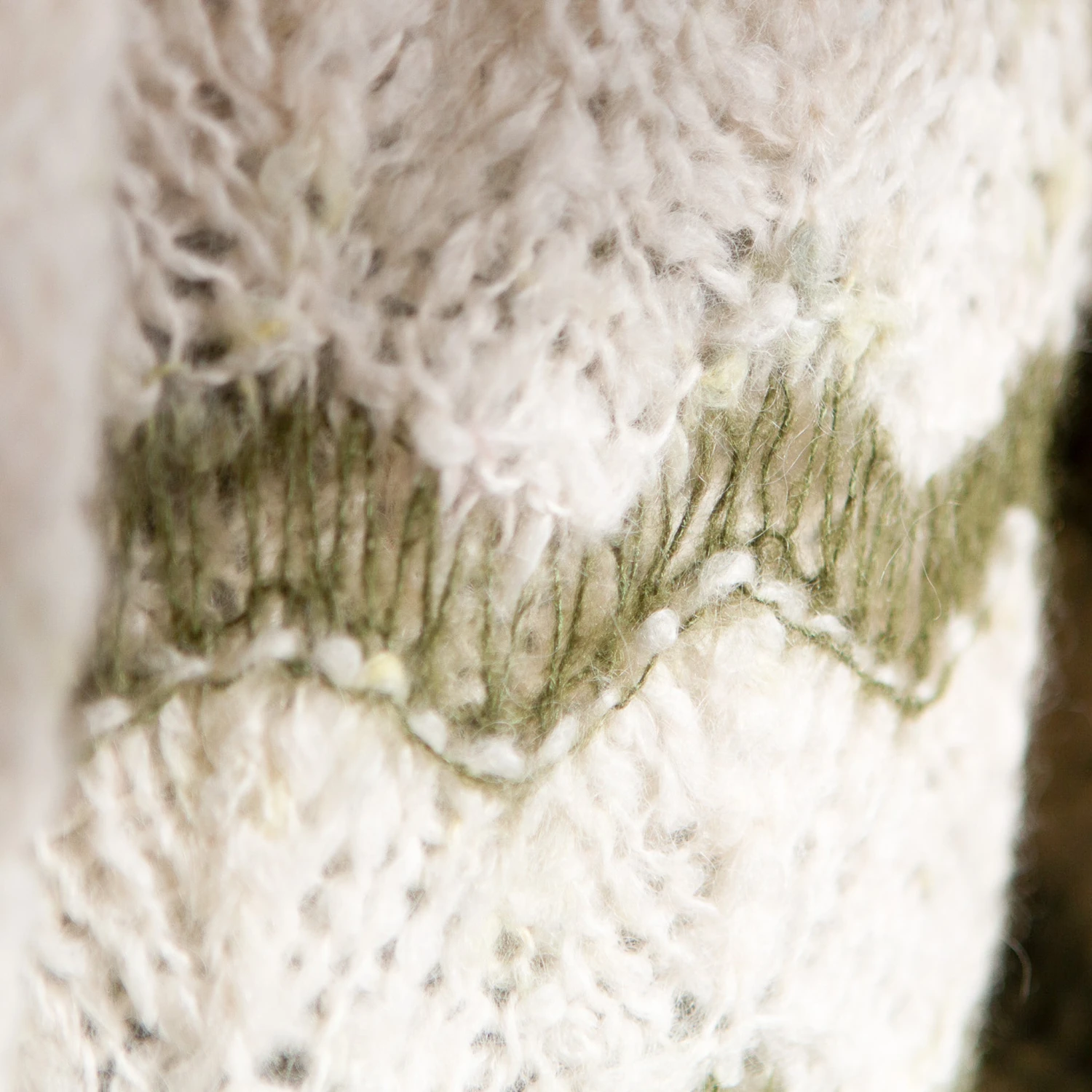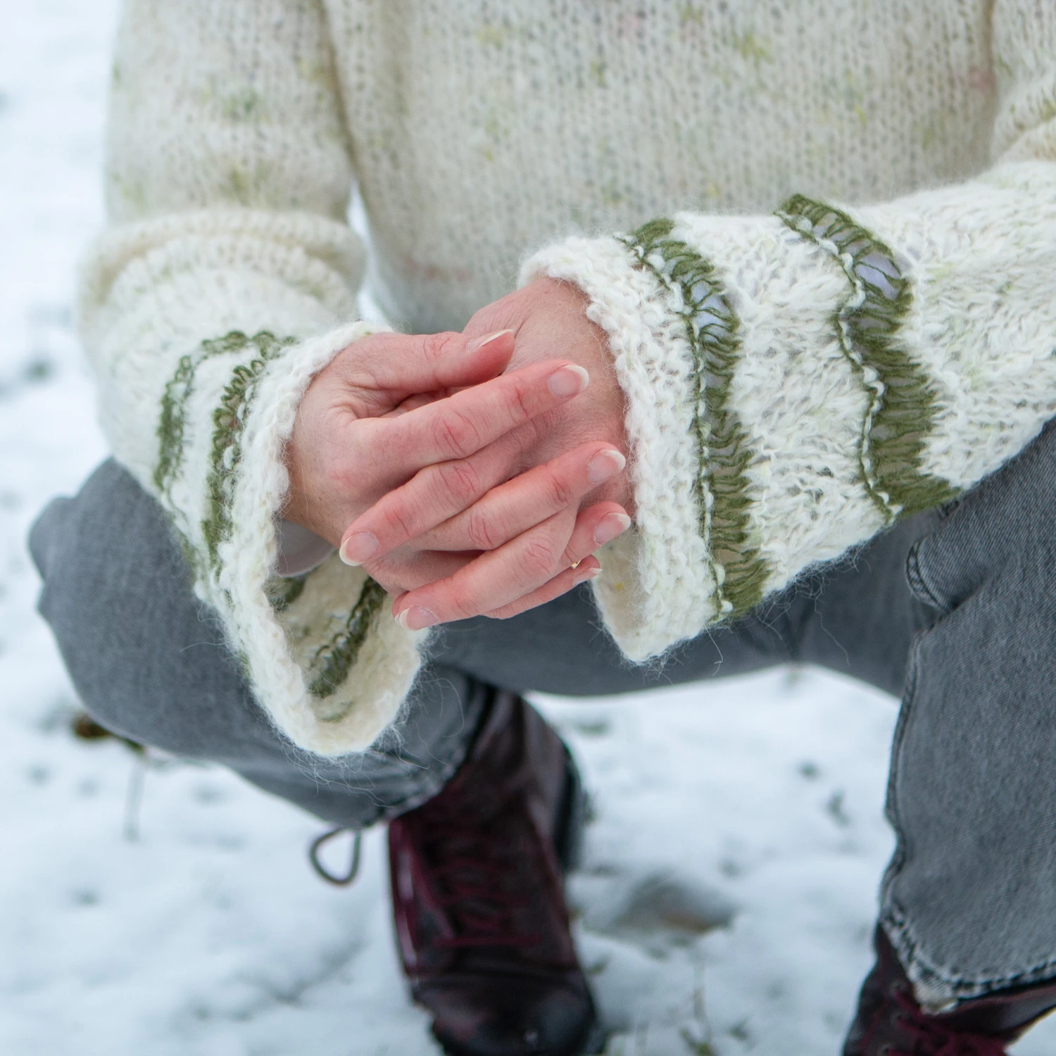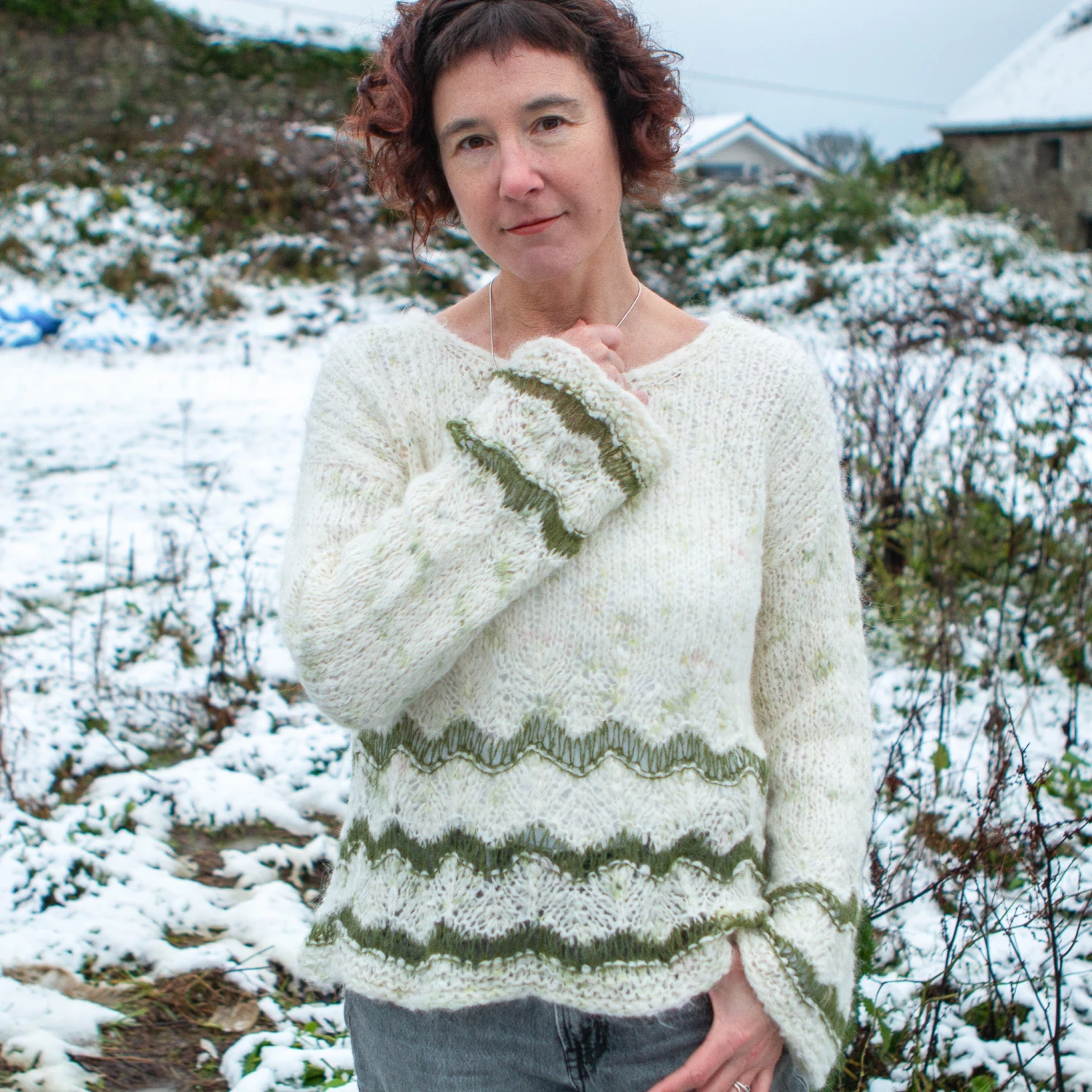 This sweater is knit from the top down with a seamless drop-shoulder construction and a simple two-colour Wave Lace pattern around the hem. Short rows will be used to slope the shoulders and the sleeves are worked in the round from the top down. There is a gentle, open flare to the edge of the cuff.