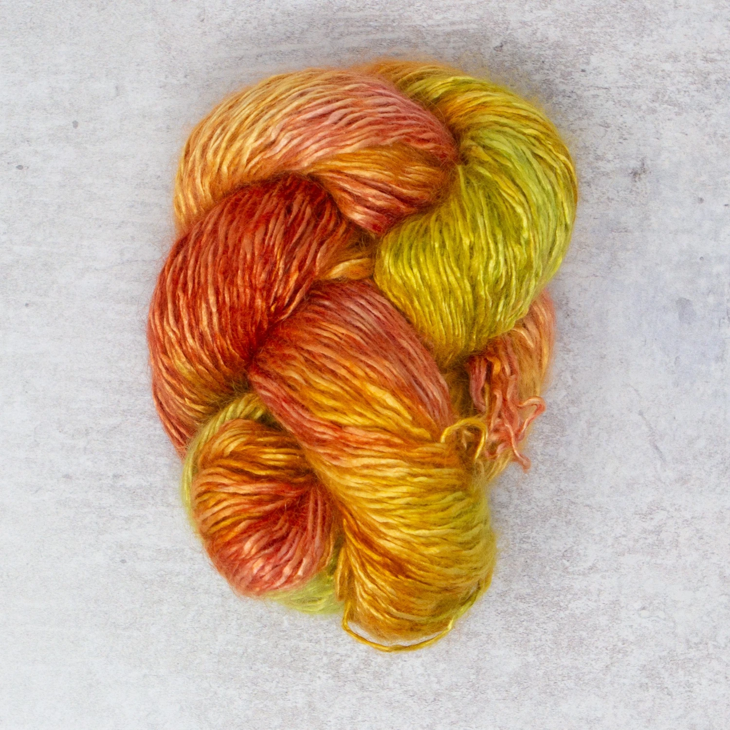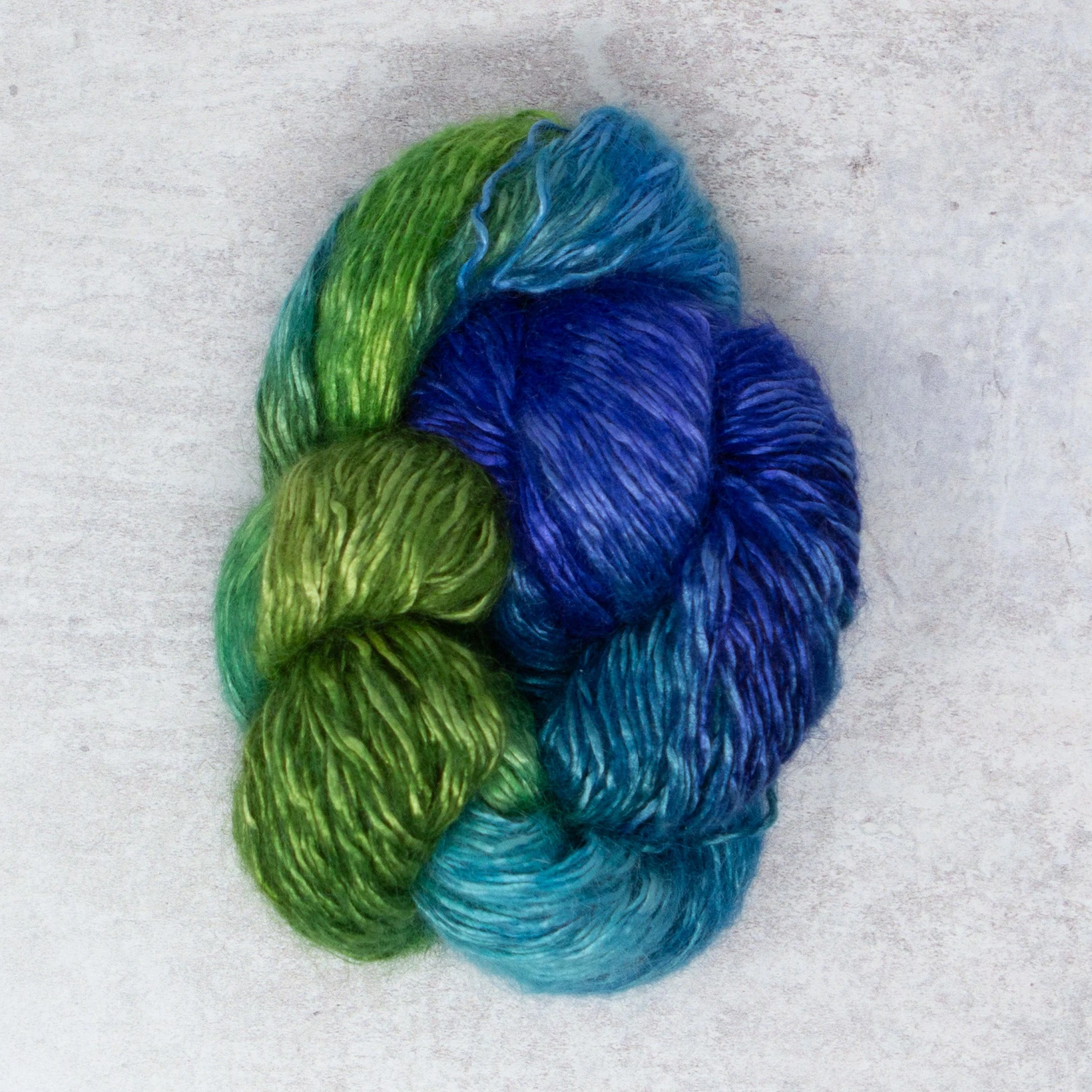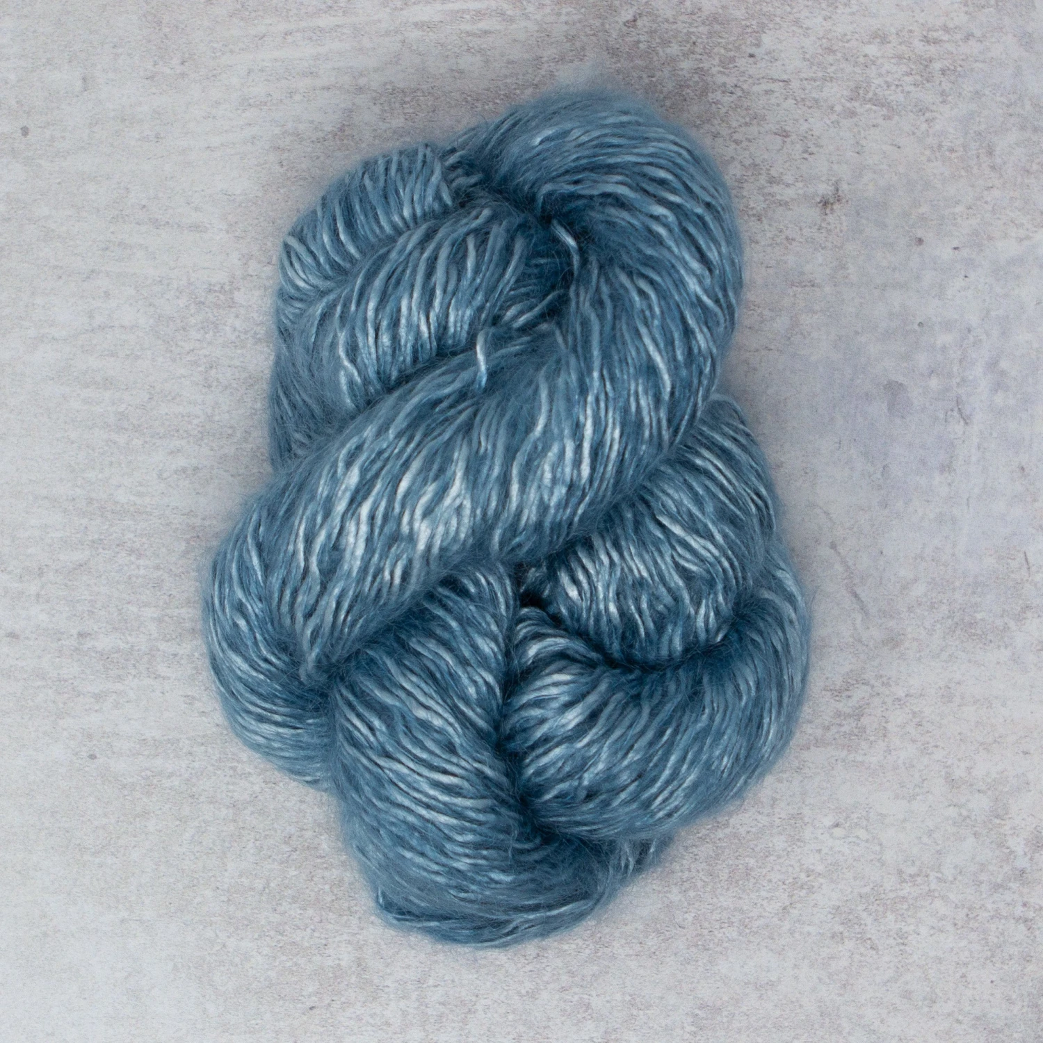 A beautiful and unusual silk and mohair yarn, Faery Wings, is a combination of a single ply of shiny silk wrapped with a strand of fluffy mohair and nylon to create a yarn with a wonderful handle and luxurious drape.