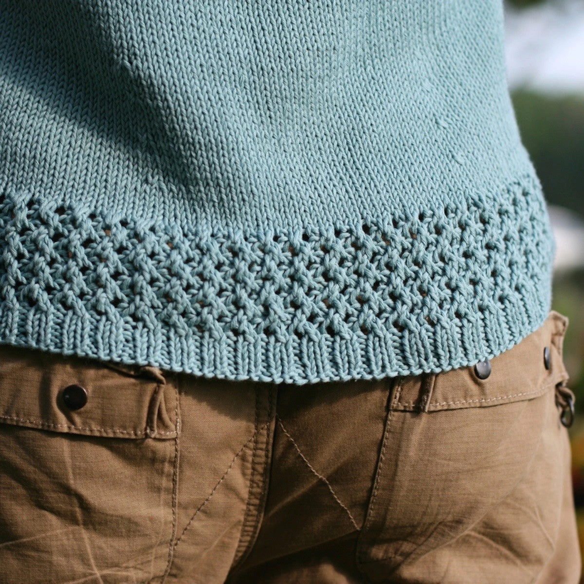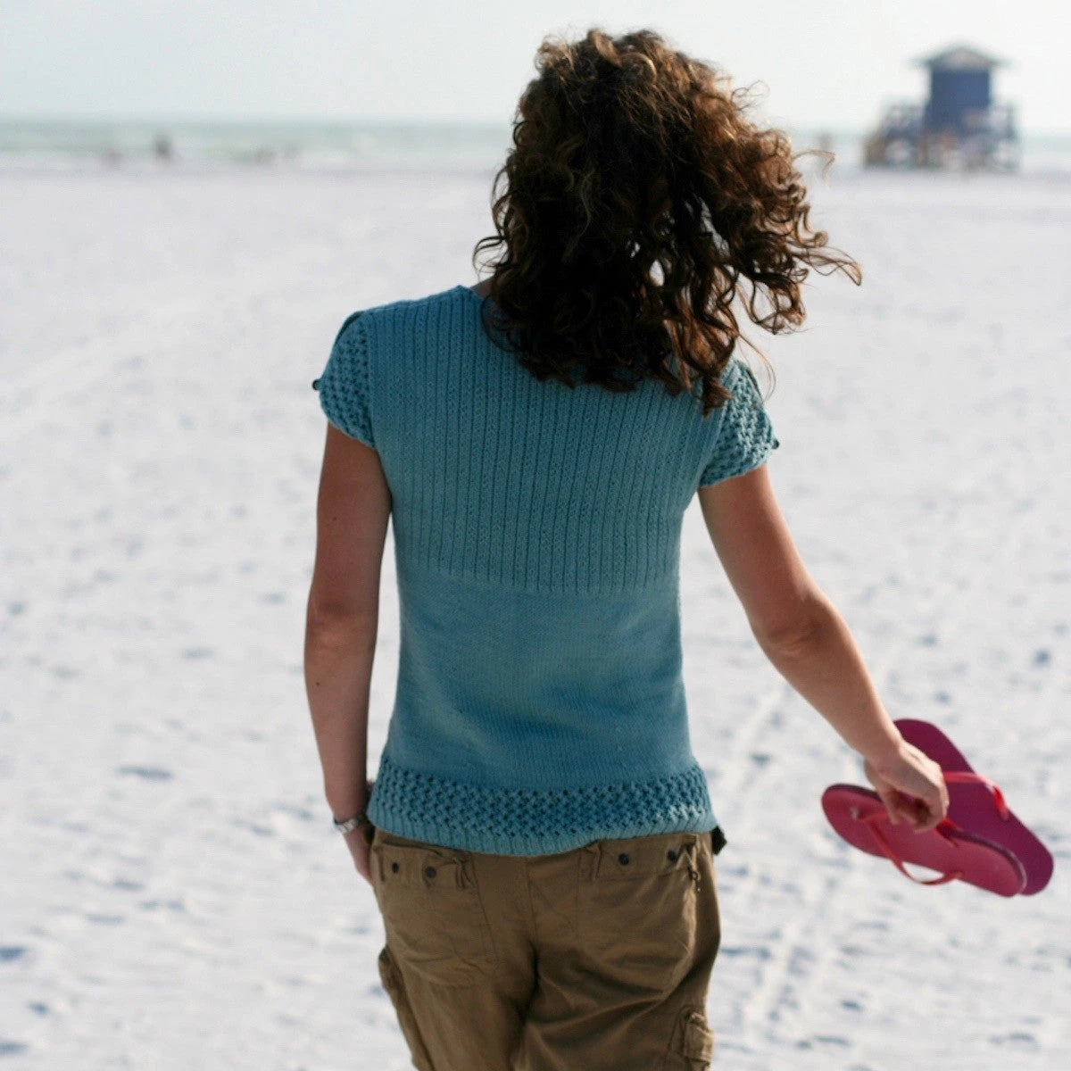 Light and airy, this seamless design is worked from the bottom right to the shoulders. Hip lace details flow together at the front, with the lace echoed on the sleeve caps.