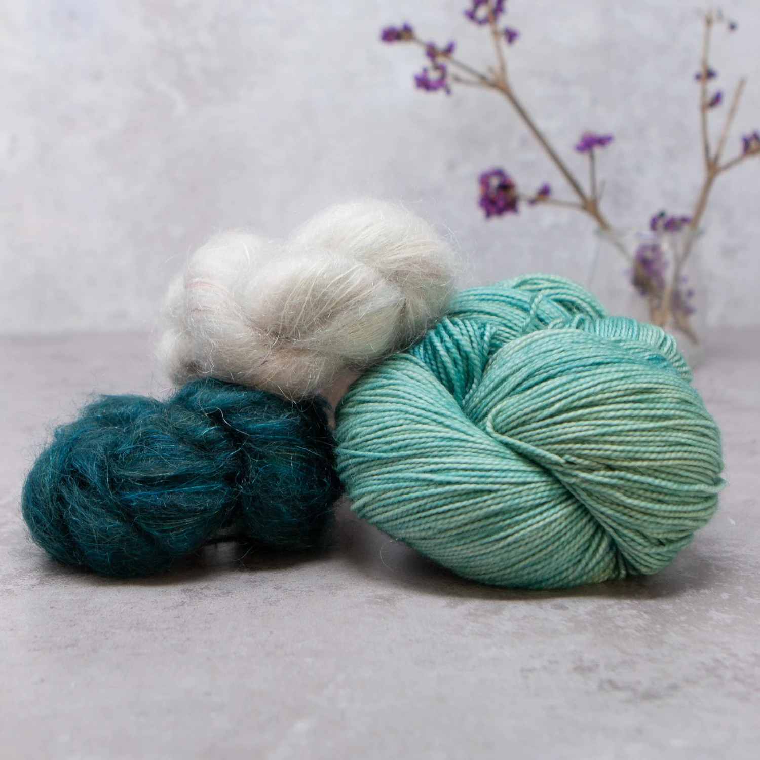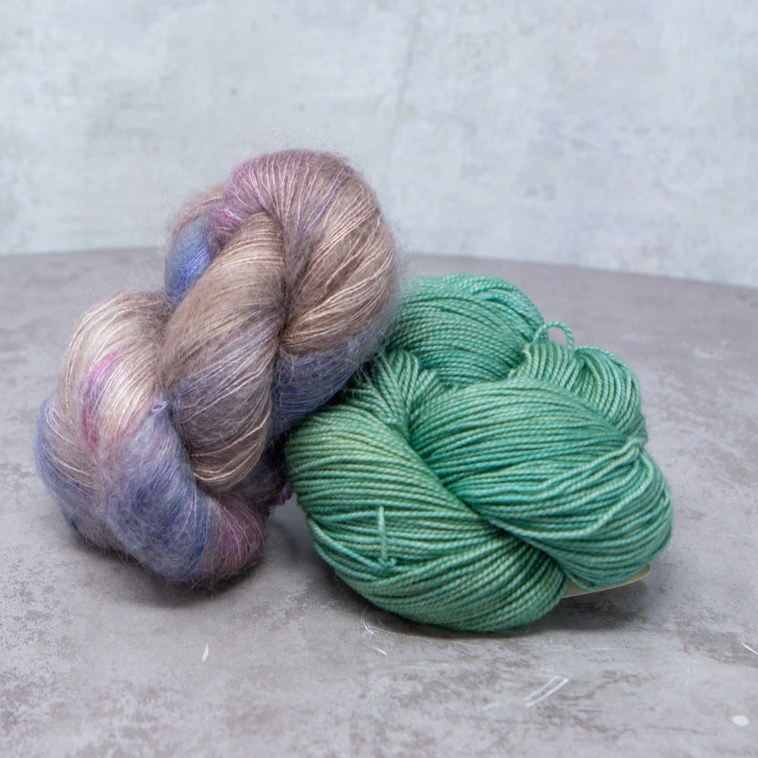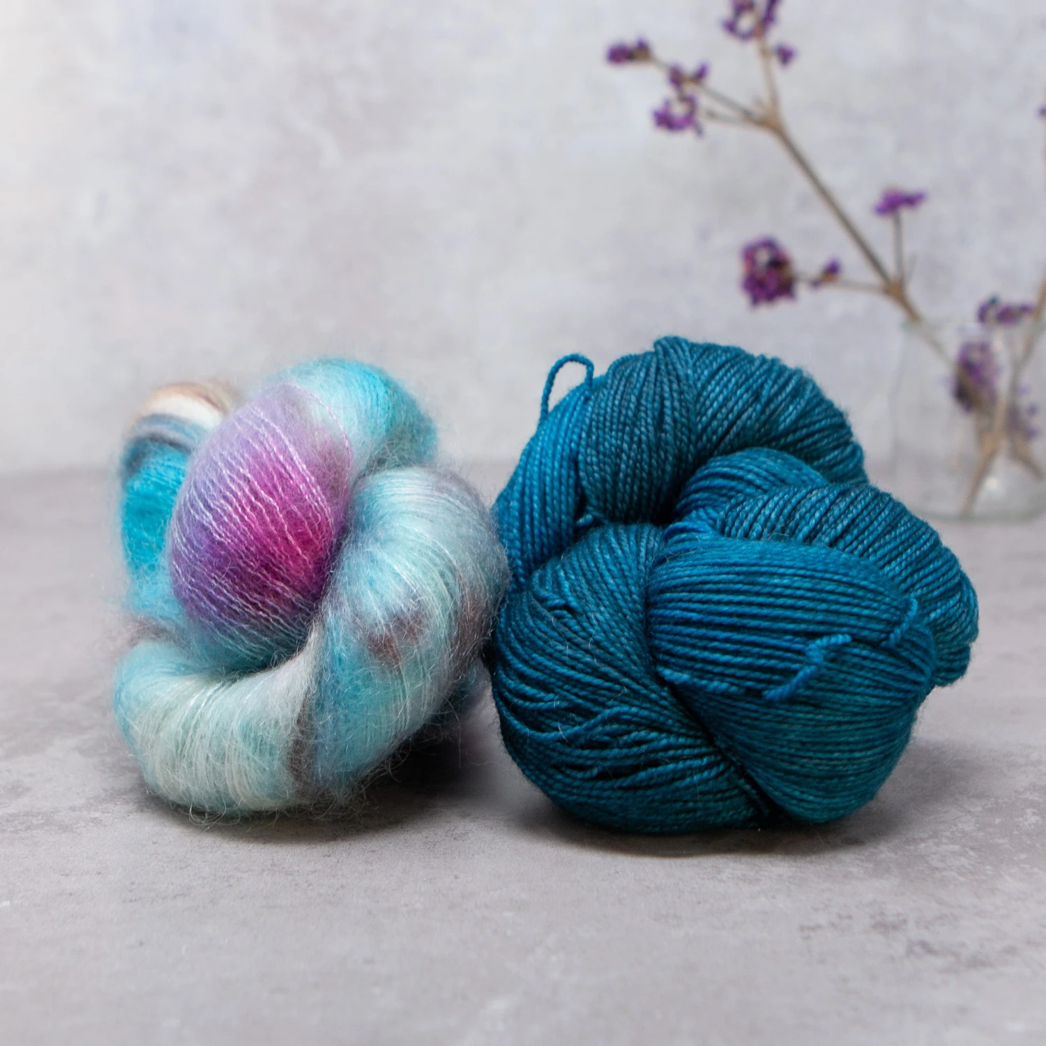 Choose from over 20 combinations; pair Vivacious 4ply with your choice of contrast colour. You can either use 2 smaller contrast colours or one single skein that is larger. We have 4 contrast options, Manos del Uruguay ‘Cabrito’, LITLG ‘Haze Lace’, Cowgirl Blues ‘Kidsilk’ or Fyberspates ‘Gleem Lace’.