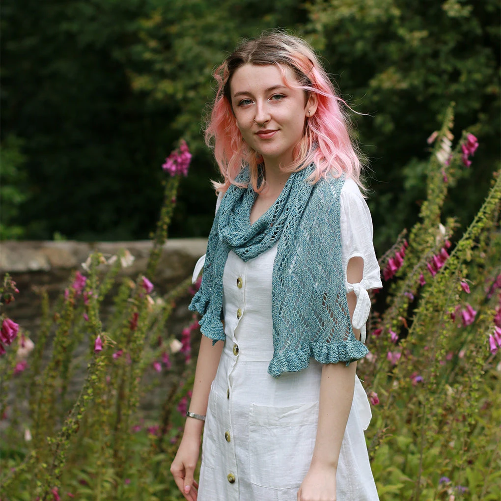 A delicate lace summer scarf with the option of ruffled edges. With easy to memorise lace repeats, it’s the perfect project to take with you on your summer travels.