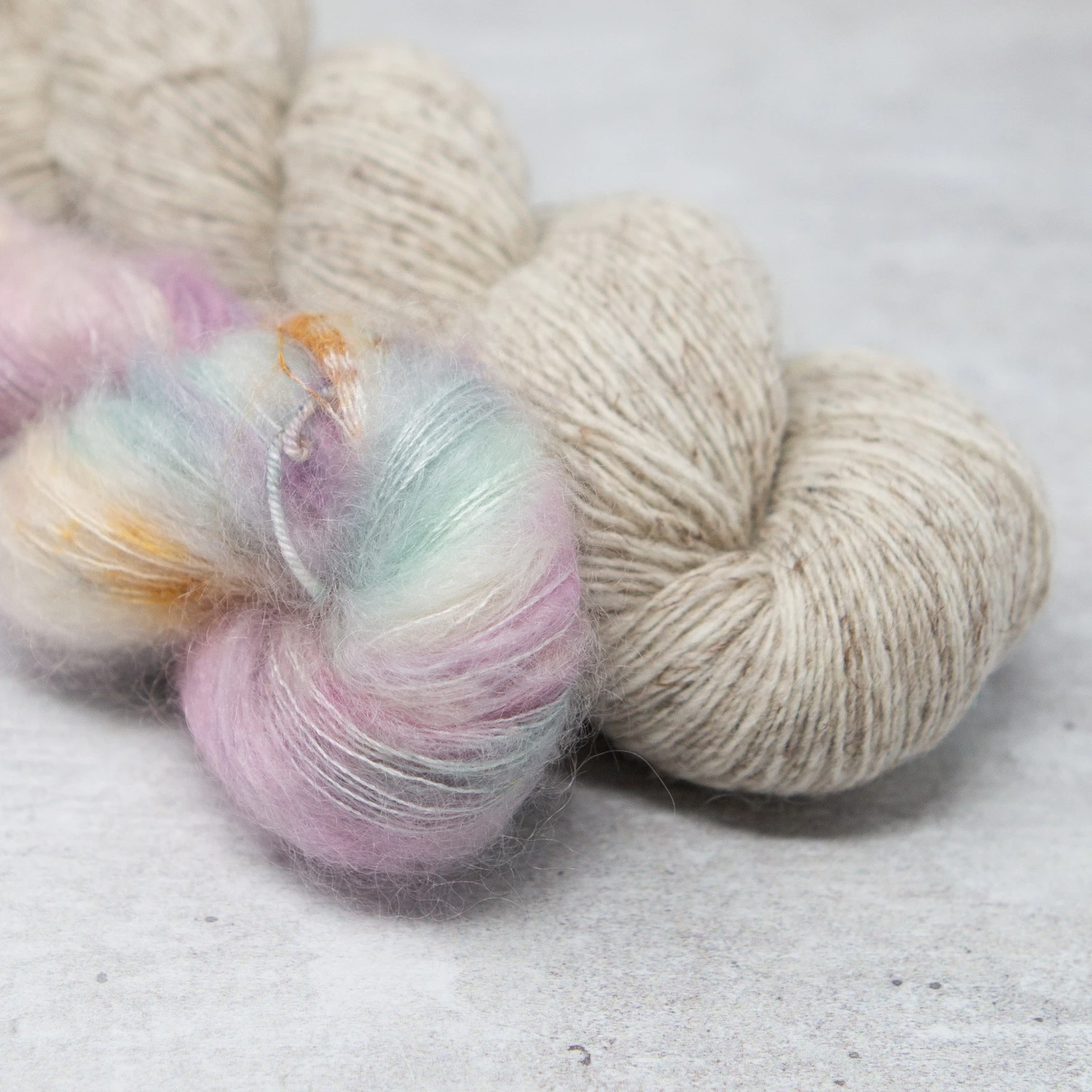 The Iascaire yarn kit contains all of the yarn needed to make Carol Feller’s Iascaire brioche sweater. Knitted double-stranded using Blasta Light with Ito Sensai or Manos Del Uruguay Cabrito, this knit is haloed and irresistibly soft.
