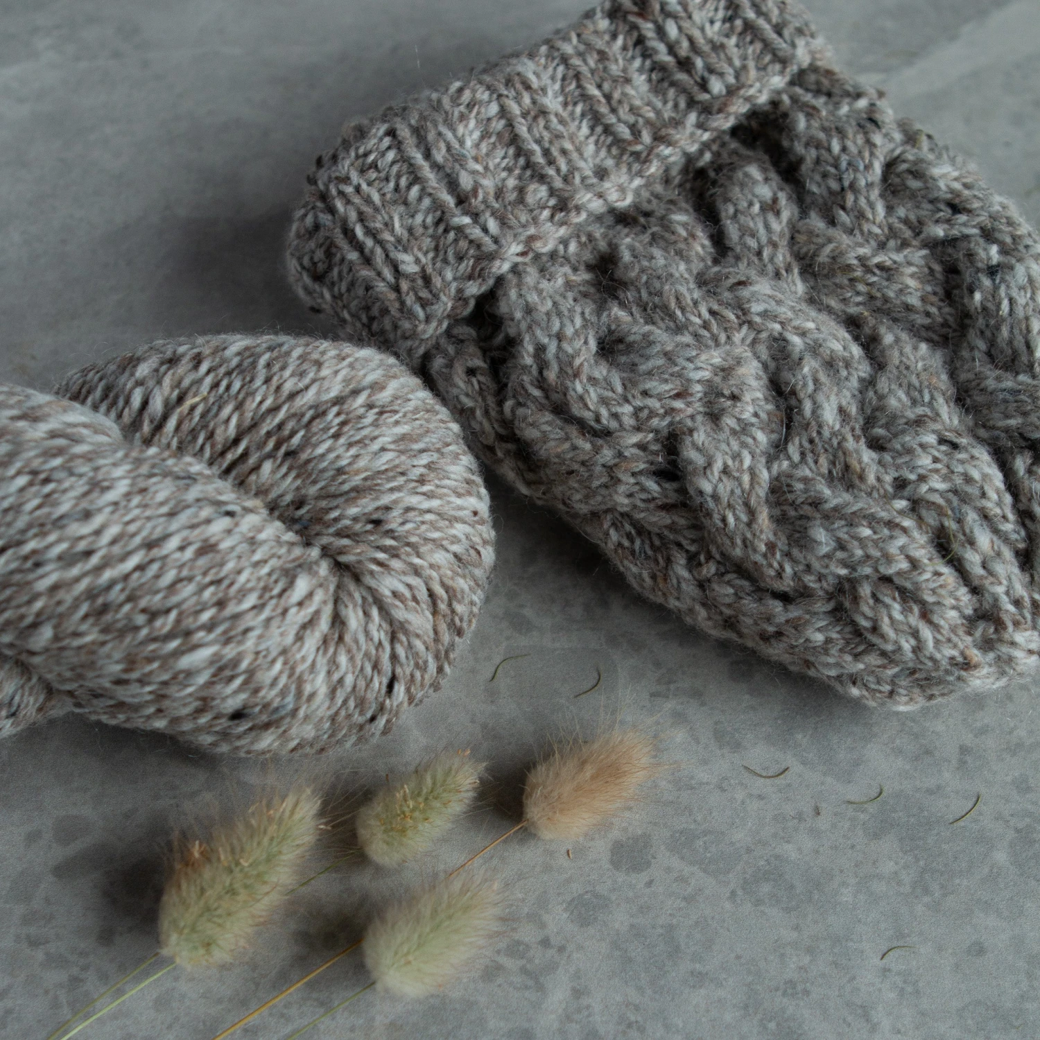 Find all the yarn you need for the both the Inis Beg Hat and Inis Beg Mitts in Stolen Stitches ‘Deas’.