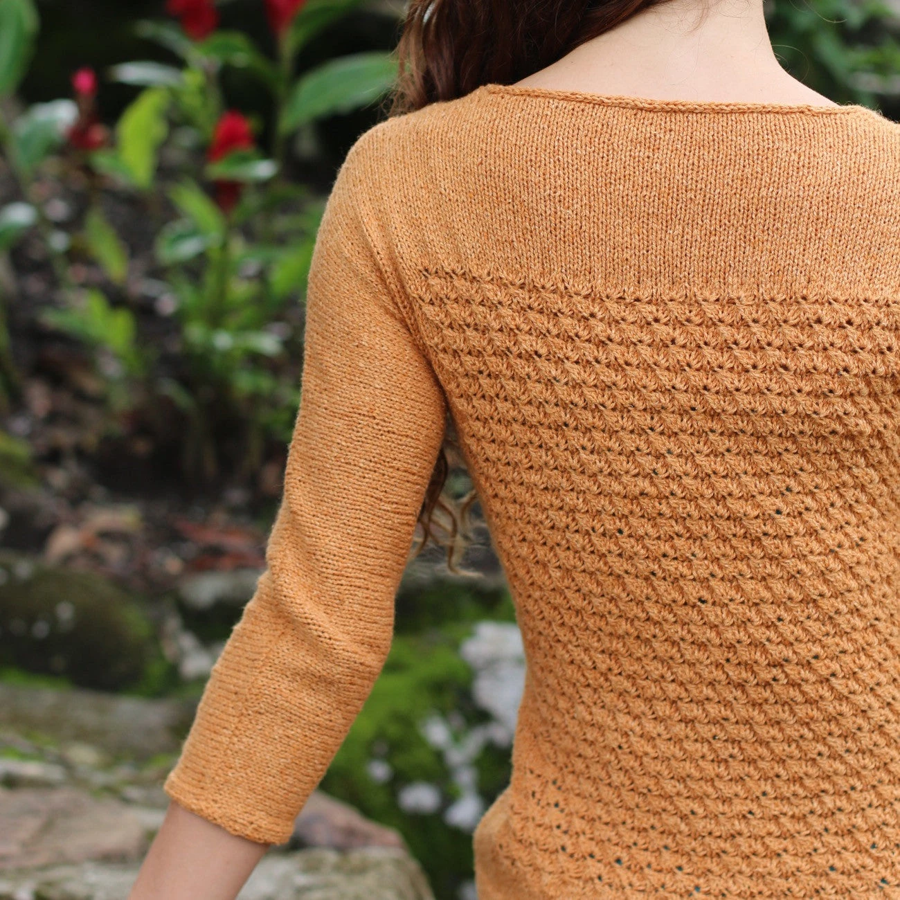 Worked in the round from the bottom up, there is gentle waist shaping, sleeves worked in one piece, and short row shoulder shaping.