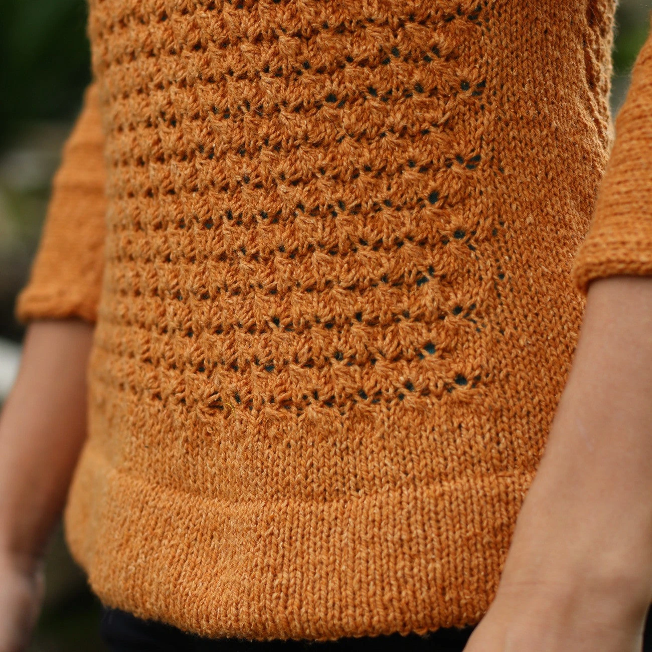 I completely fell in love with the delicate texture and faint diagonals of the Clustered Star pattern stitch, which takes centre stage in this sweater.