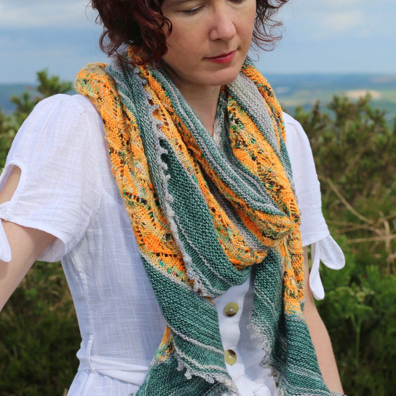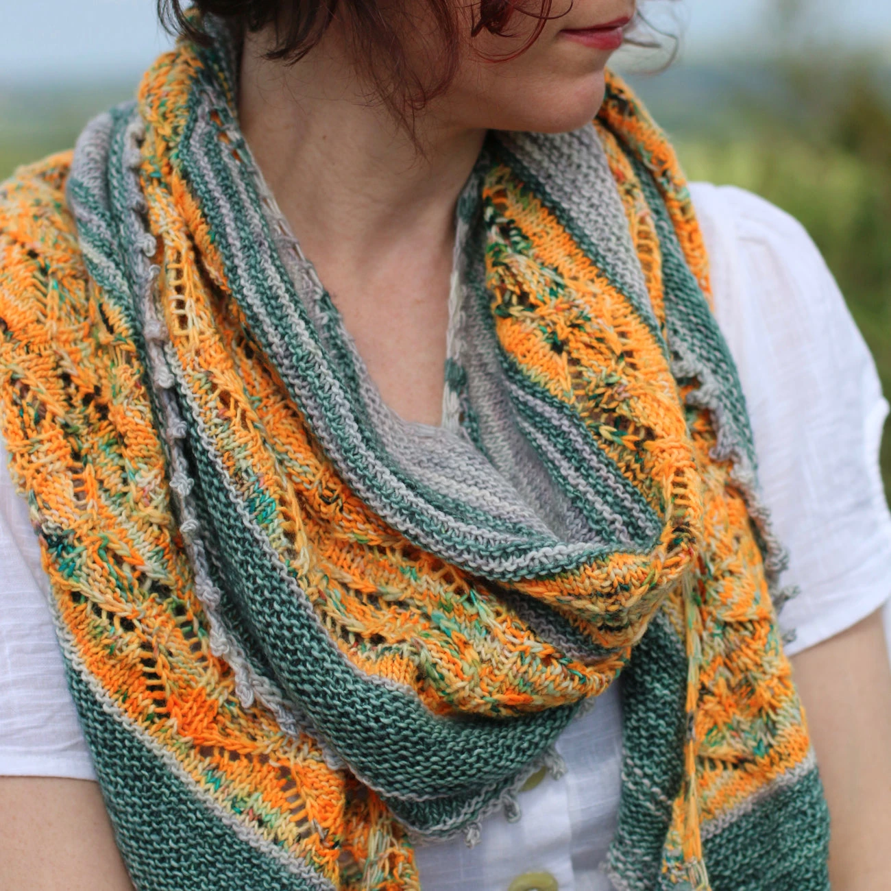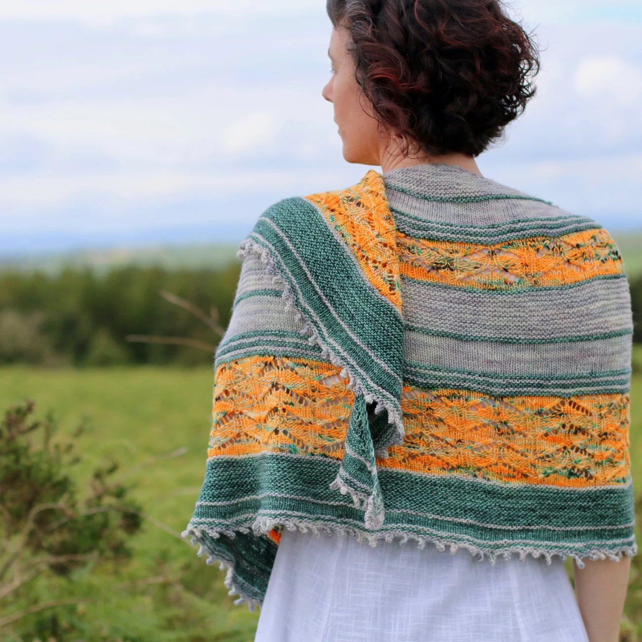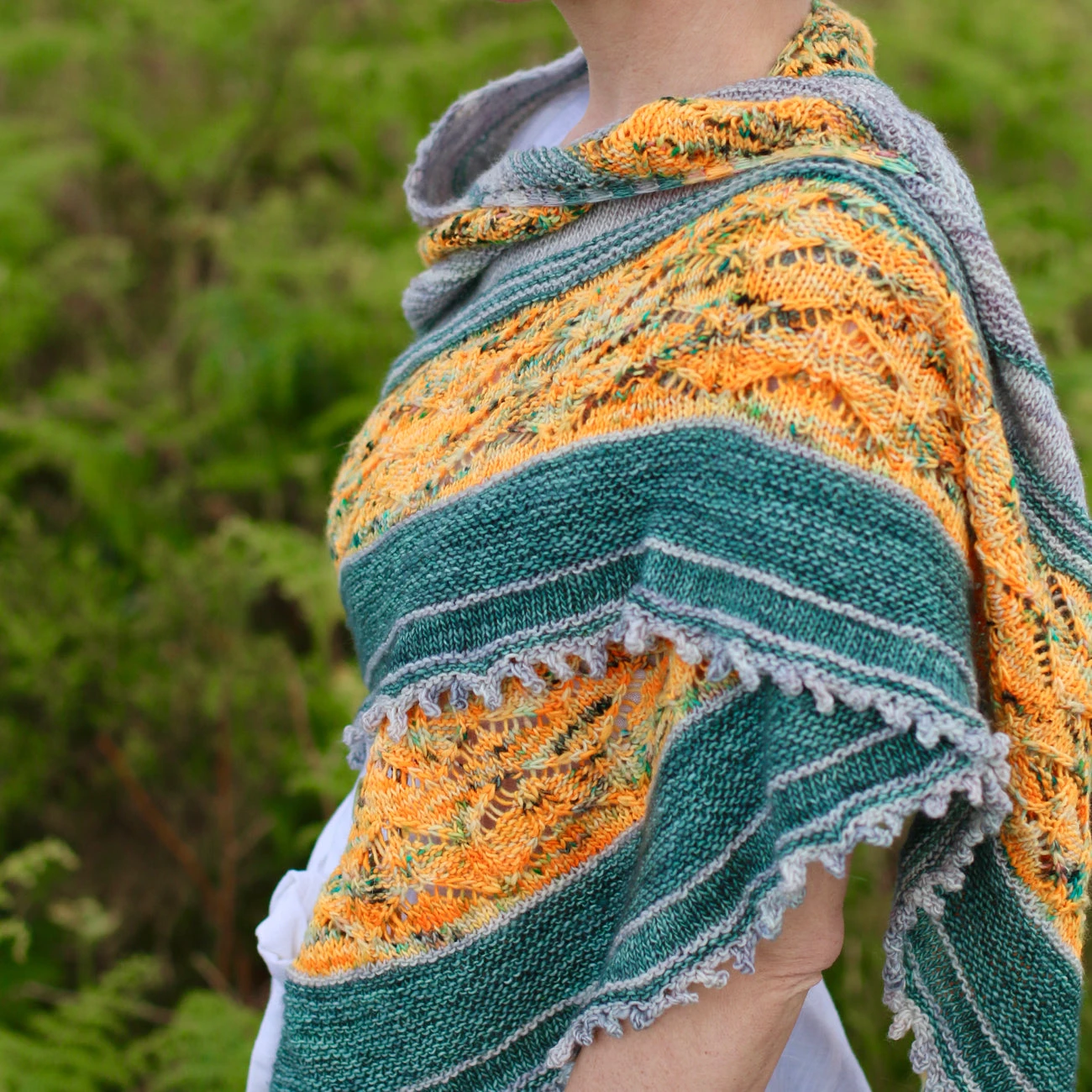 This wide, flowing shawl, wraps comfortably around the body and over your shoulder. It begins at the top with a small number of stitches and increases quickly, combining garter stitch and stockinette stitch in 2 colours. Pops of bright colour are provided by the lace pattern which get wider with each repeat. Finally the shawl finishes with a delicate Picot bind off for the prefect finish.