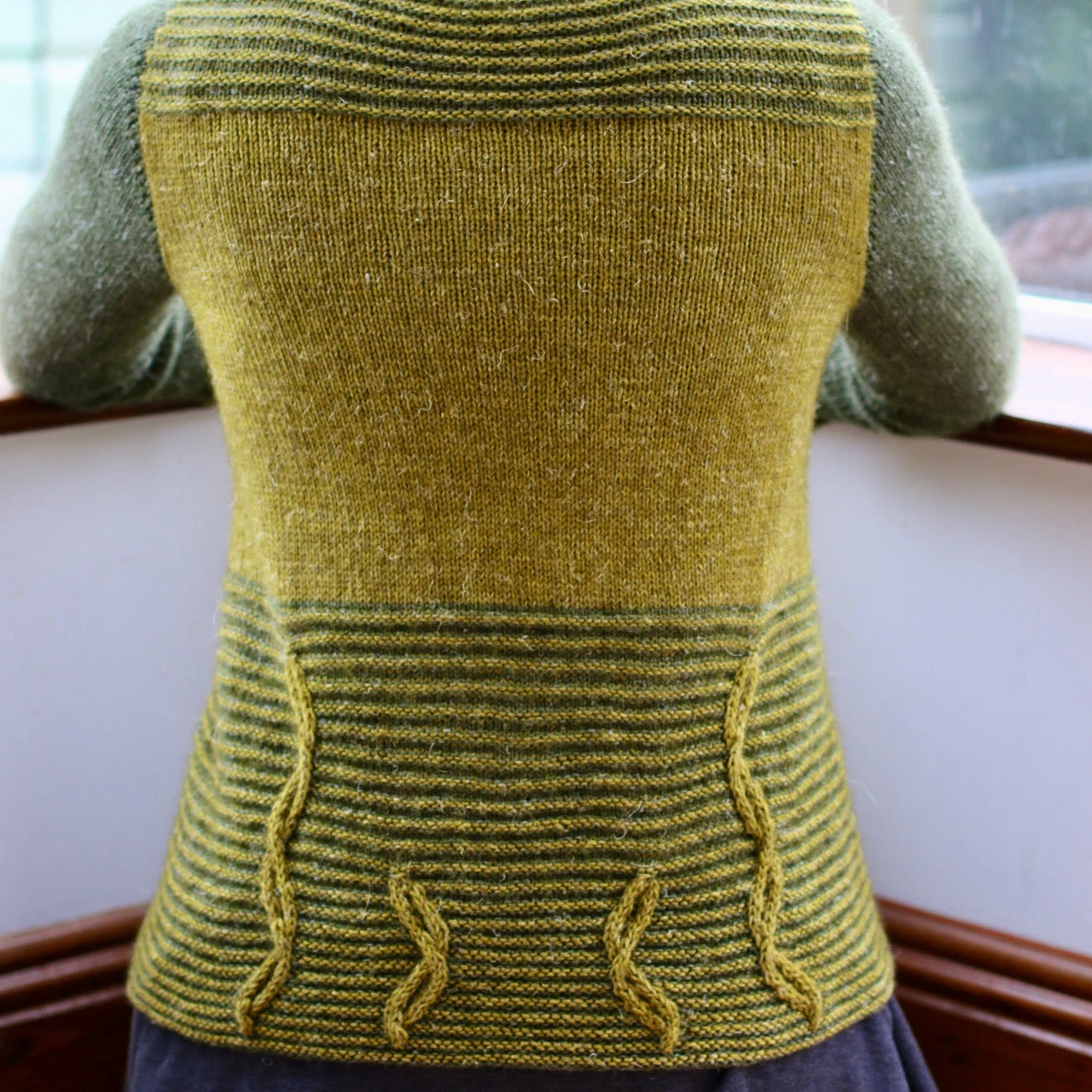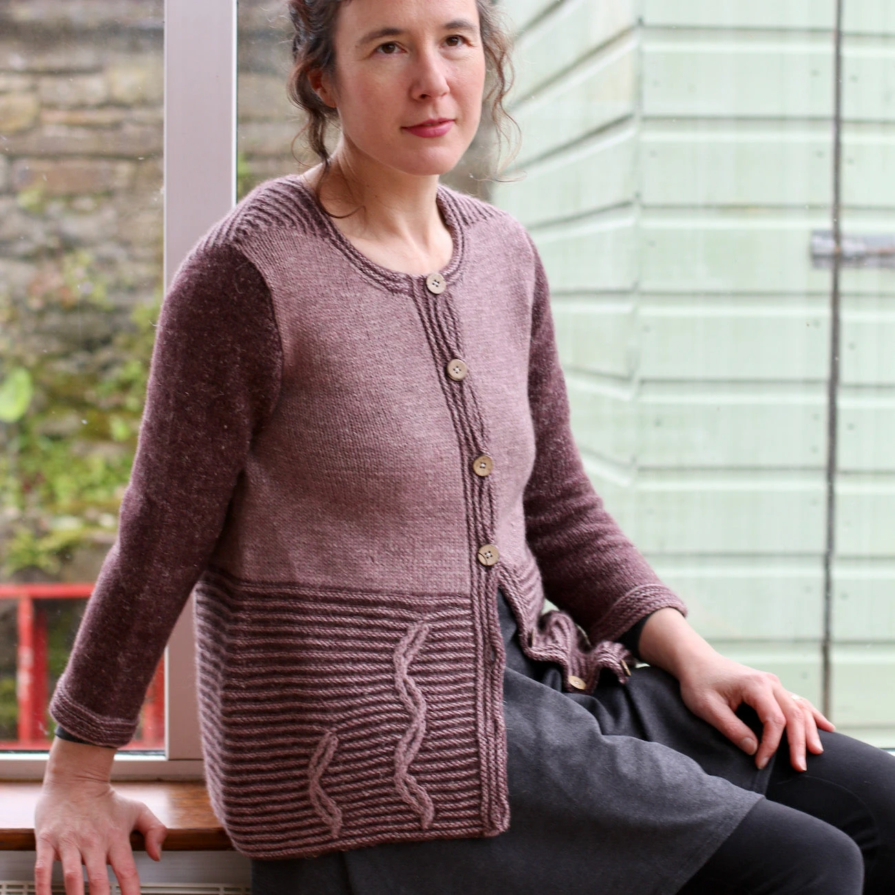 Double garter stitch and gently twisting DNA cables help to create a stunning cardigan. Knit from the top down with short row set-in sleeves and a gentle a-line shape.