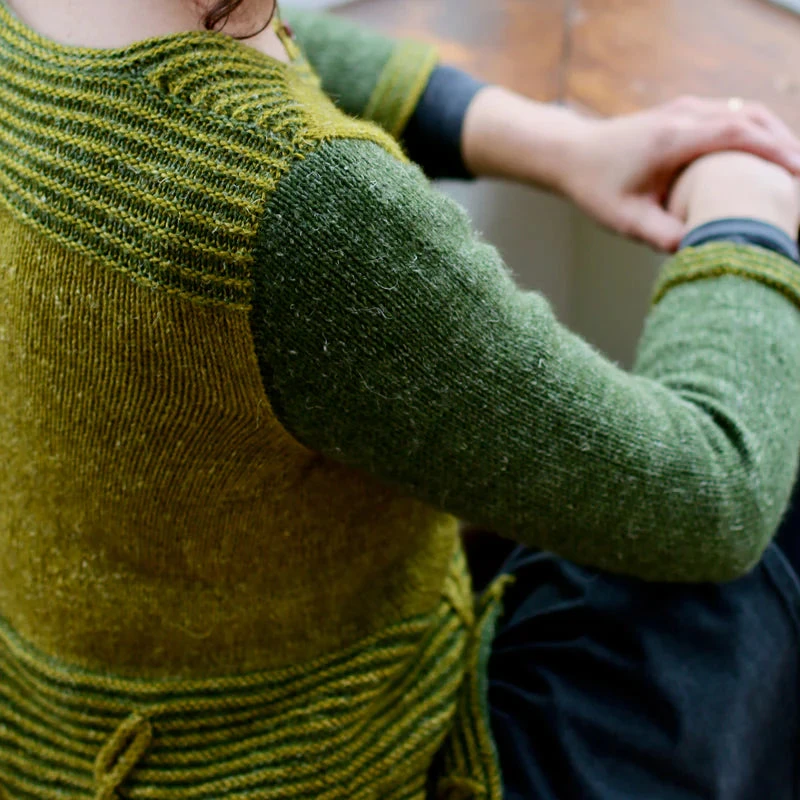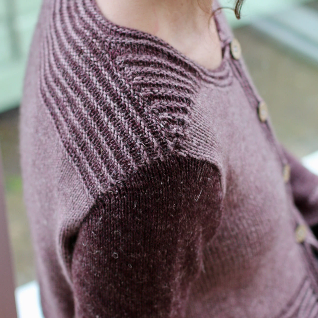 Double garter stitch and gently twisting DNA cables help to create a stunning cardigan. Knit from the top down with short row set-in sleeves and a gentle a-line shape.
