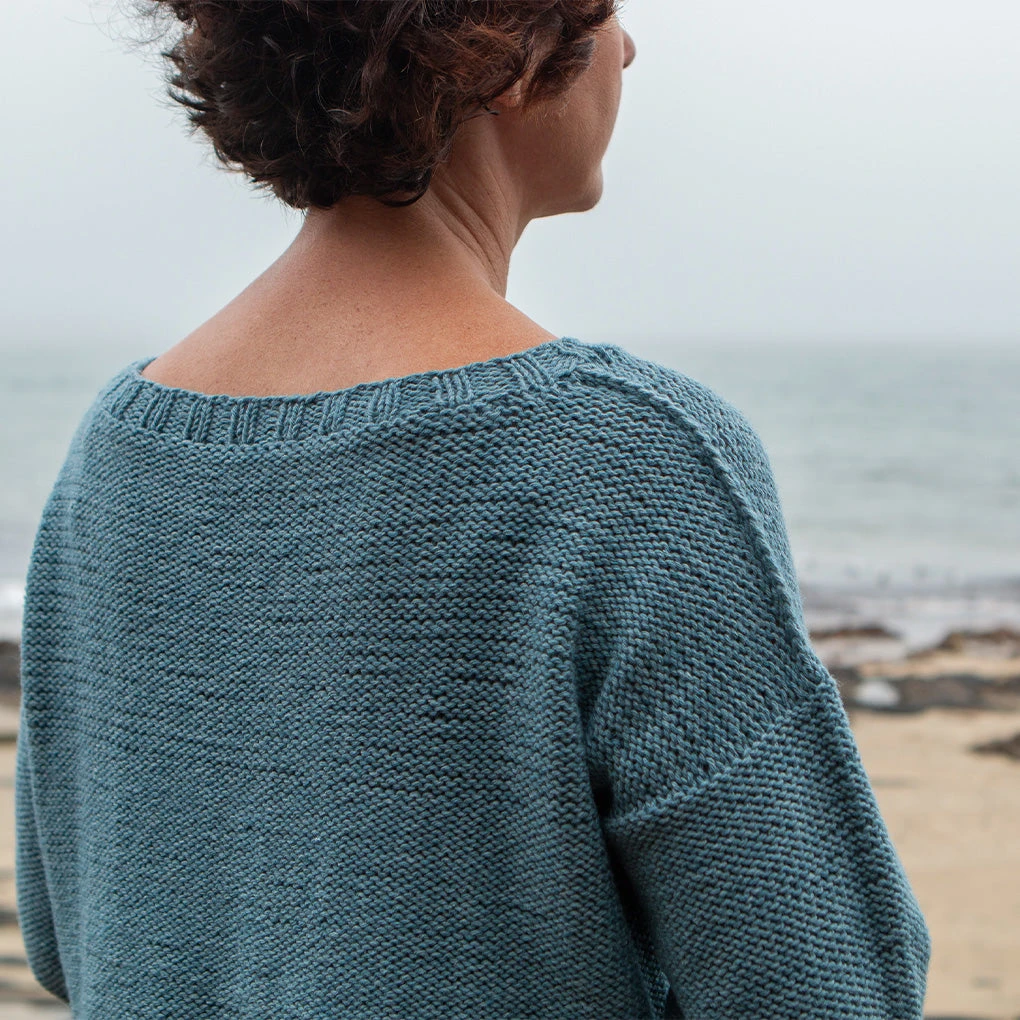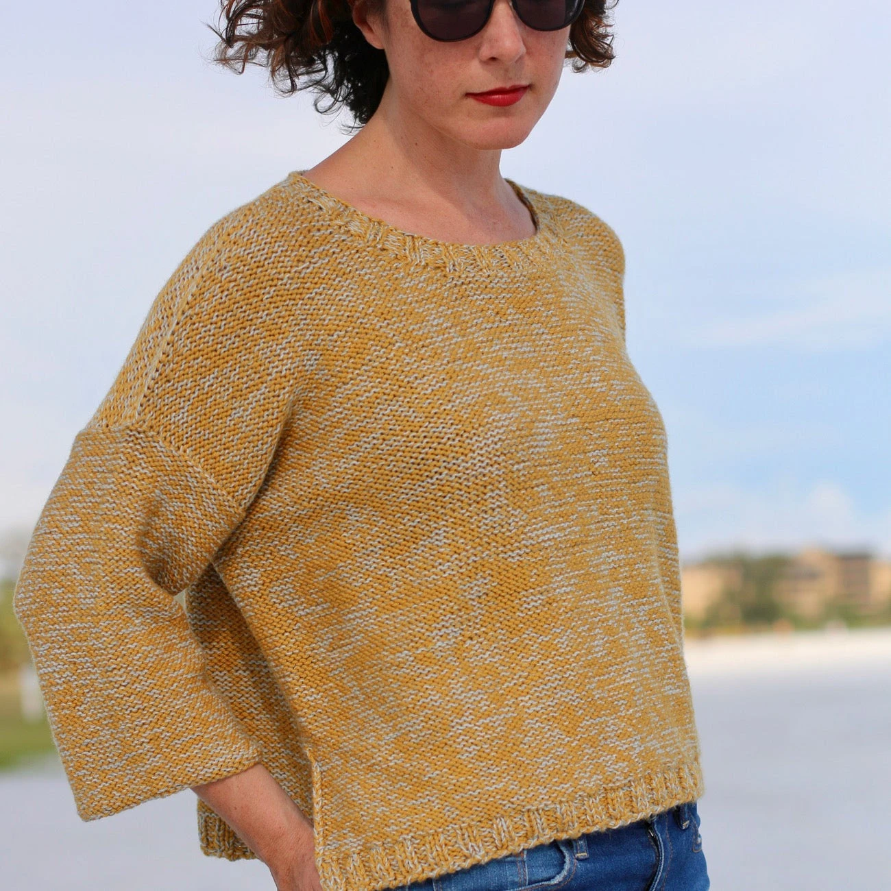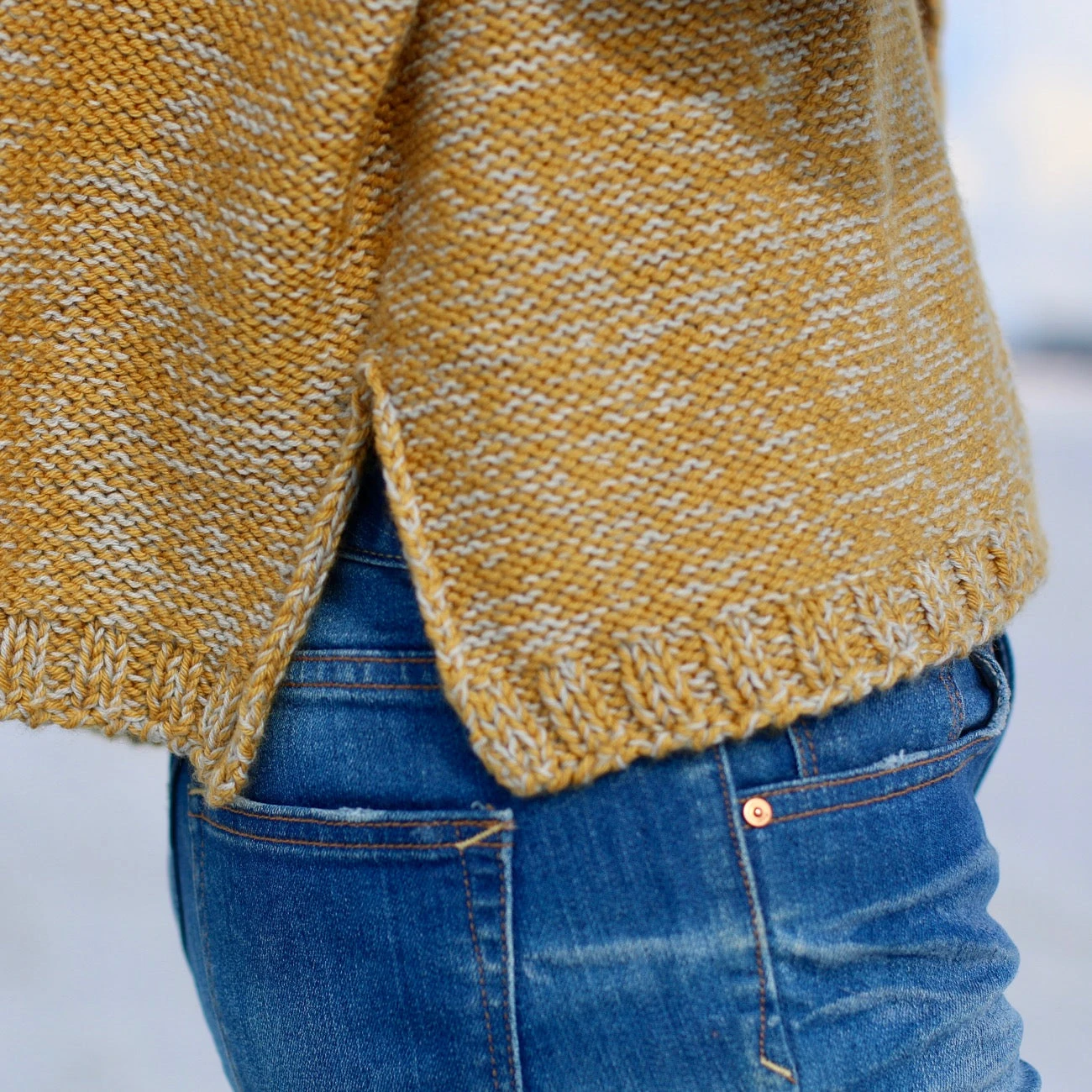 This sweater is designed to fit a very wide range of sizes, as the boxy shape works very well with large amounts of positive ease to drape. The sweater is knit using a DK and fingering yarn in different colours held together to create a marled effect. You could even try a fingering weight yarn with a halo (such as mohair) to create a totally different effect!