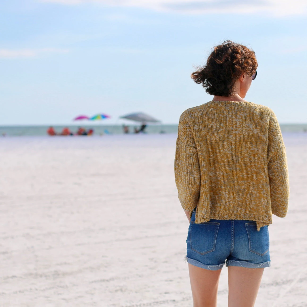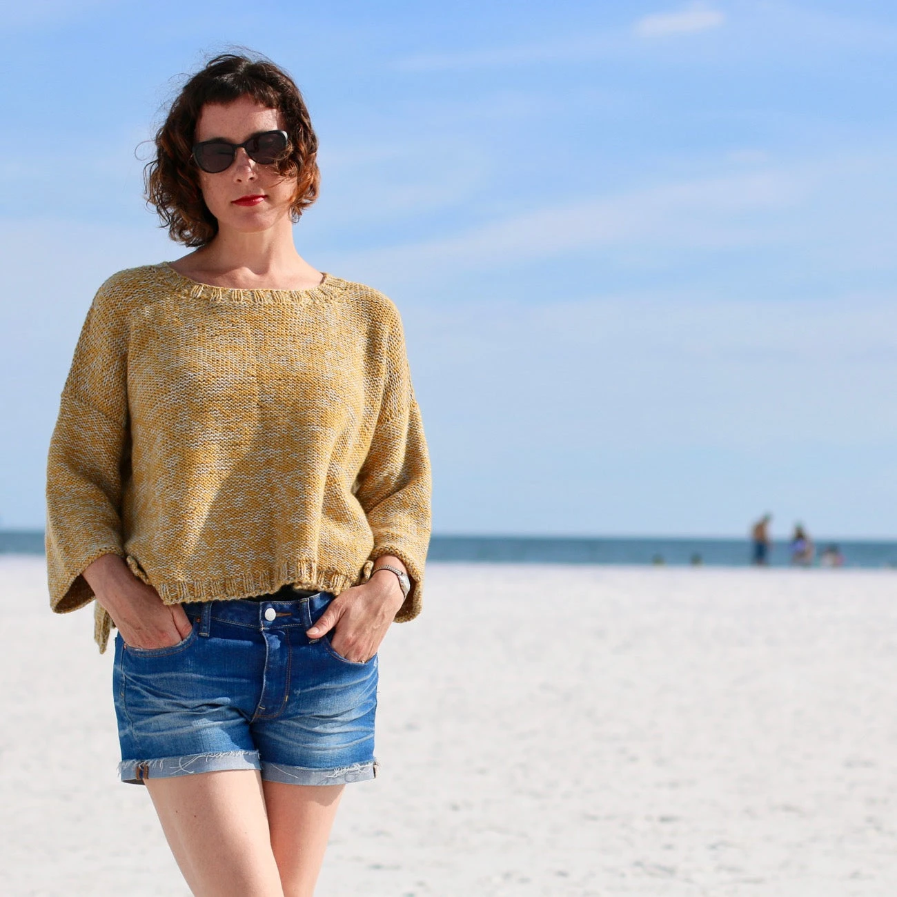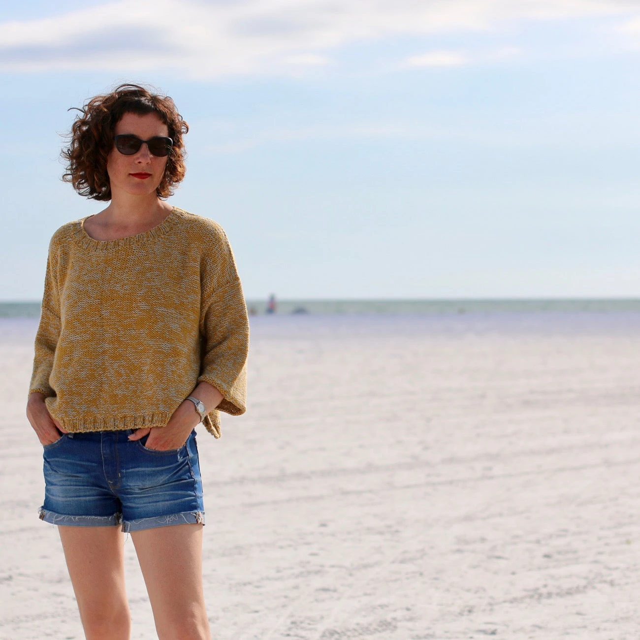 This sweater is designed to fit a very wide range of sizes, as the boxy shape works very well with large amounts of positive ease to drape. The sweater is knit using a DK and fingering yarn in different colours held together to create a marled effect. You could even try a fingering weight yarn with a halo (such as mohair) to create a totally different effect!