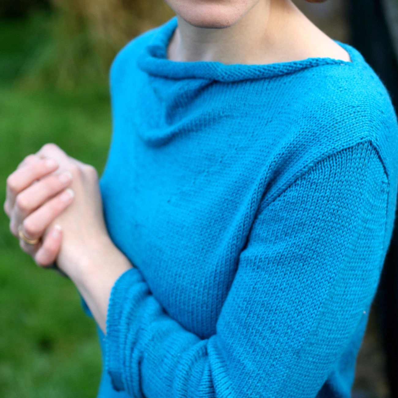 Simplicity and elegance are key in this understated top. Drama is created using an open draped neckline and ruched hemlines. This top is knit as a lightweight material from fingering weight yarn that has been knit with a loose gauge which creates a flattering, stretchy material. Knit in the round from the bottom up, the ruches and hem are created as you knit. When the body is finished, the sleeves are picked up and knit down from the armhole (using short rows) leaving you with minimal finishing when the knitting is done.