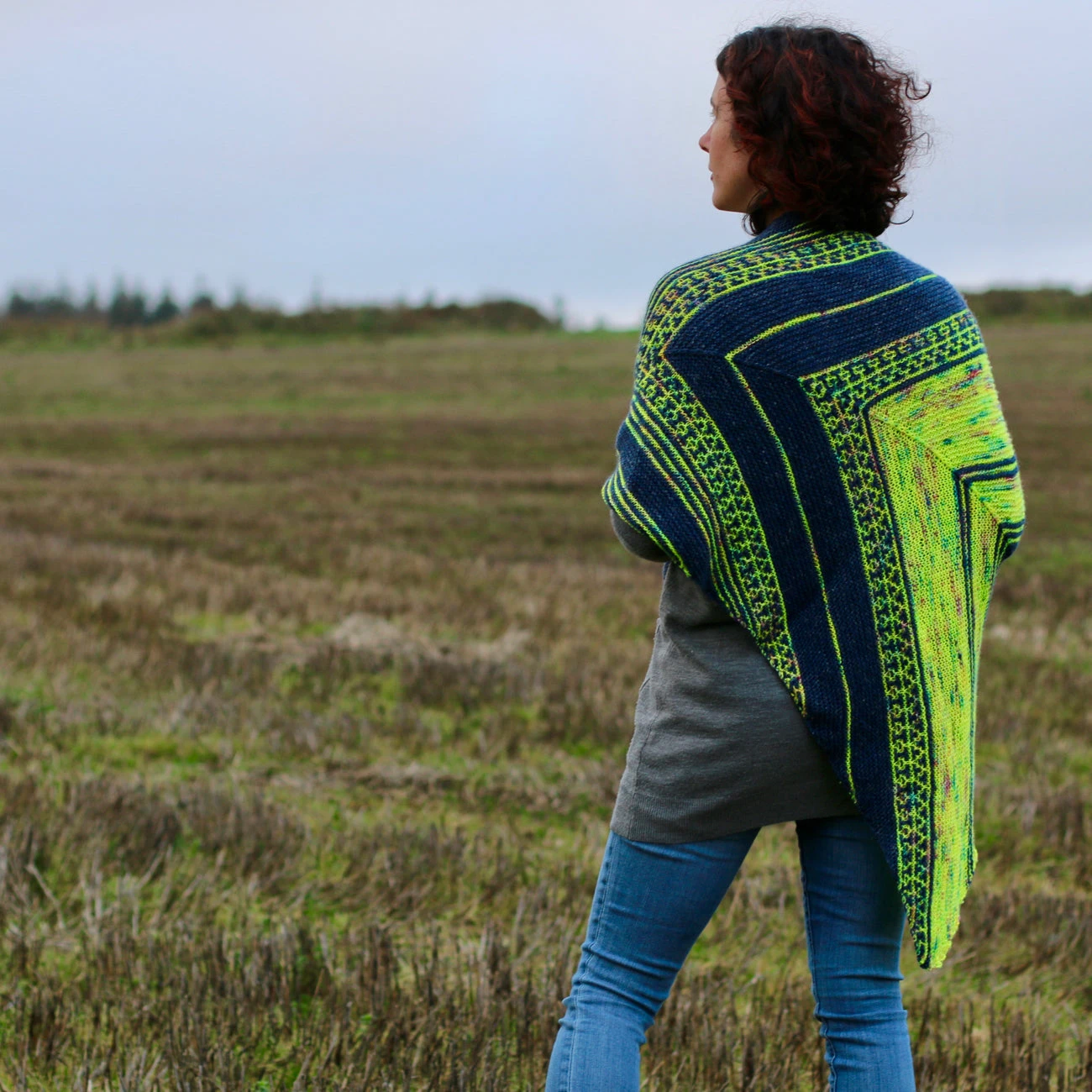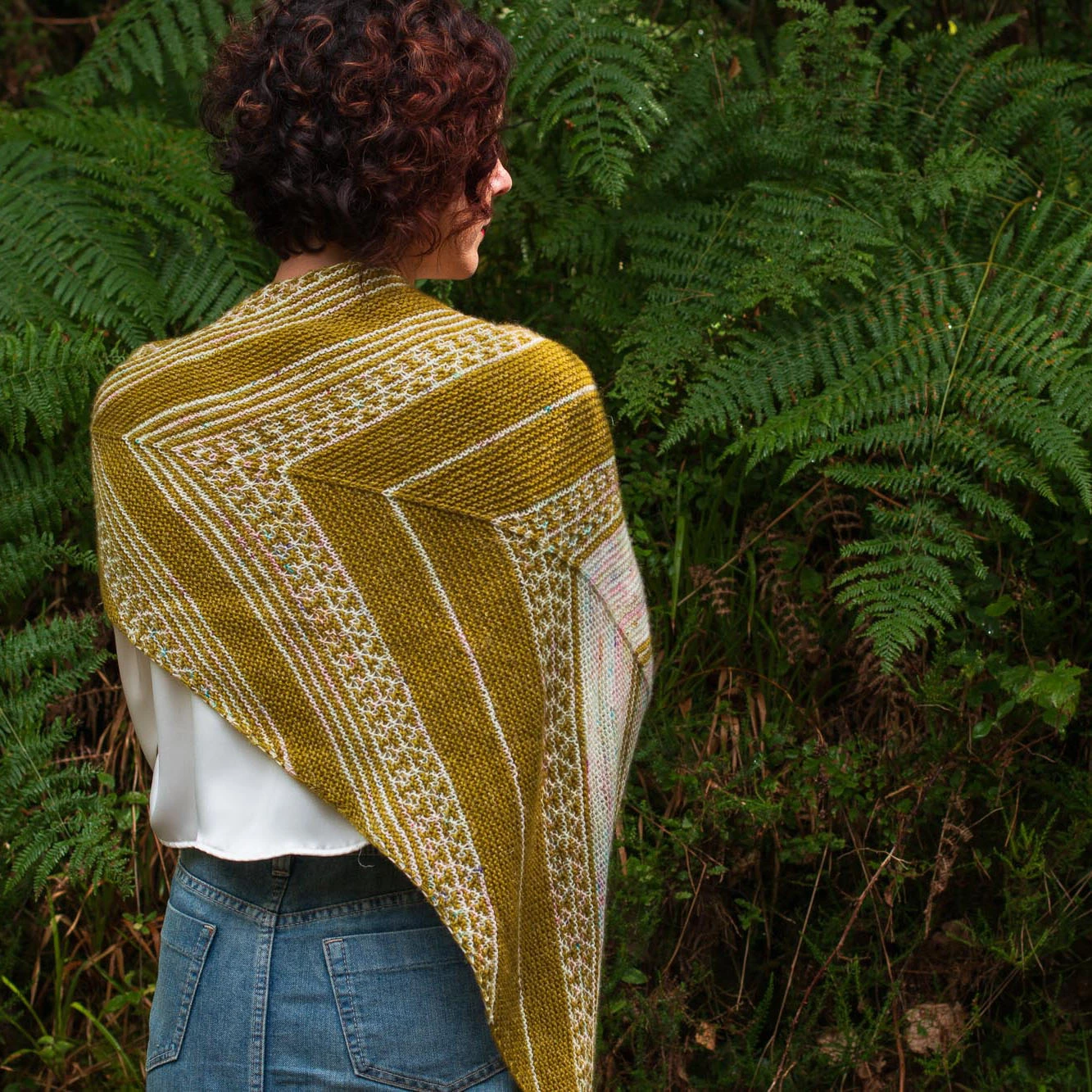 This shawl starts at the very tip and increases out to the widest point creating a chevron in garter and mosaic pattern stripes by using increases and decreases.