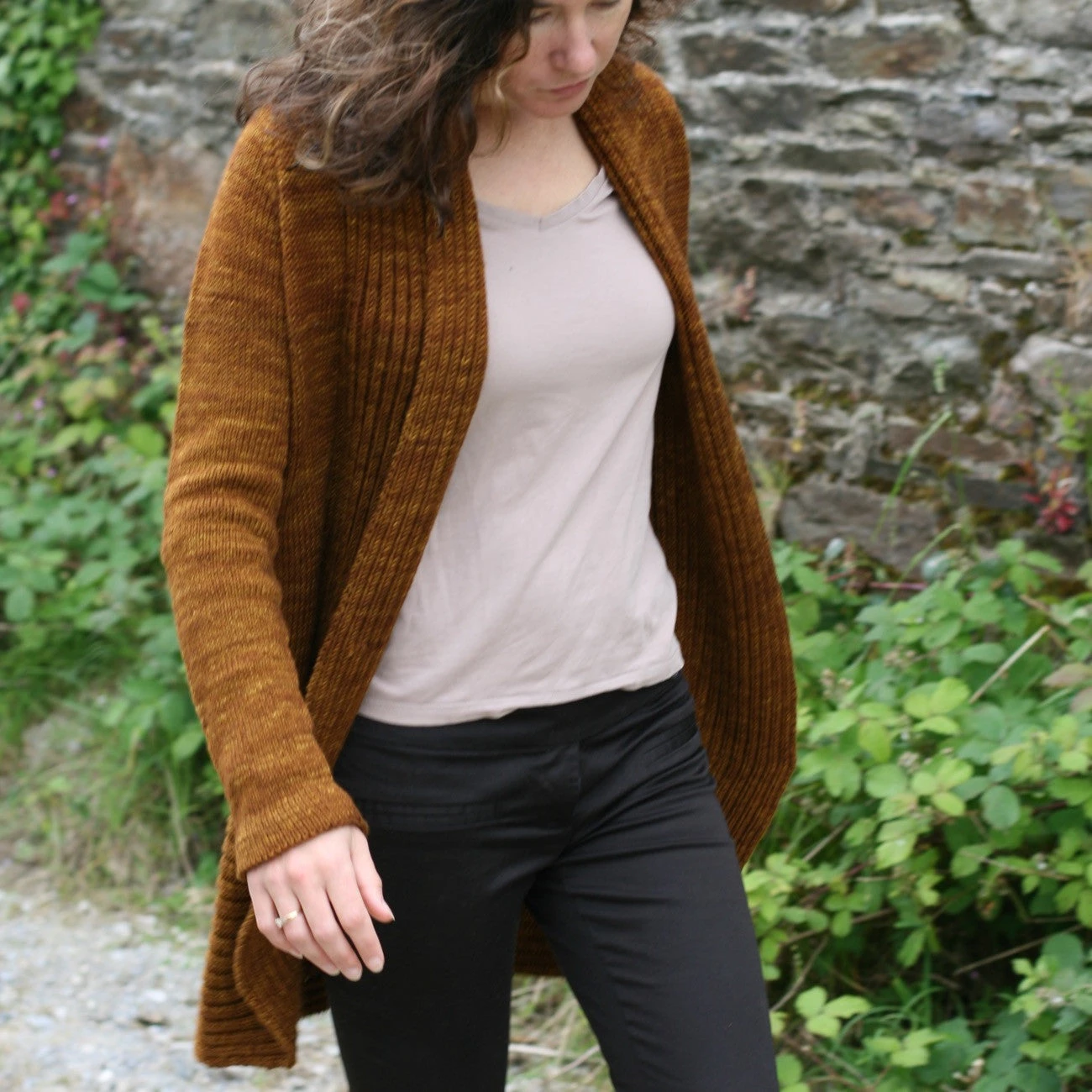 Sleek and flattering, this cardigan is knit in one piece from the top down. The wide front collar can be folded back or wrapped around depending on your mood (and the weather!). Raglan shoulder shaping is worked in one piece and there is minimal seaming except for the back of neck and hip edging.