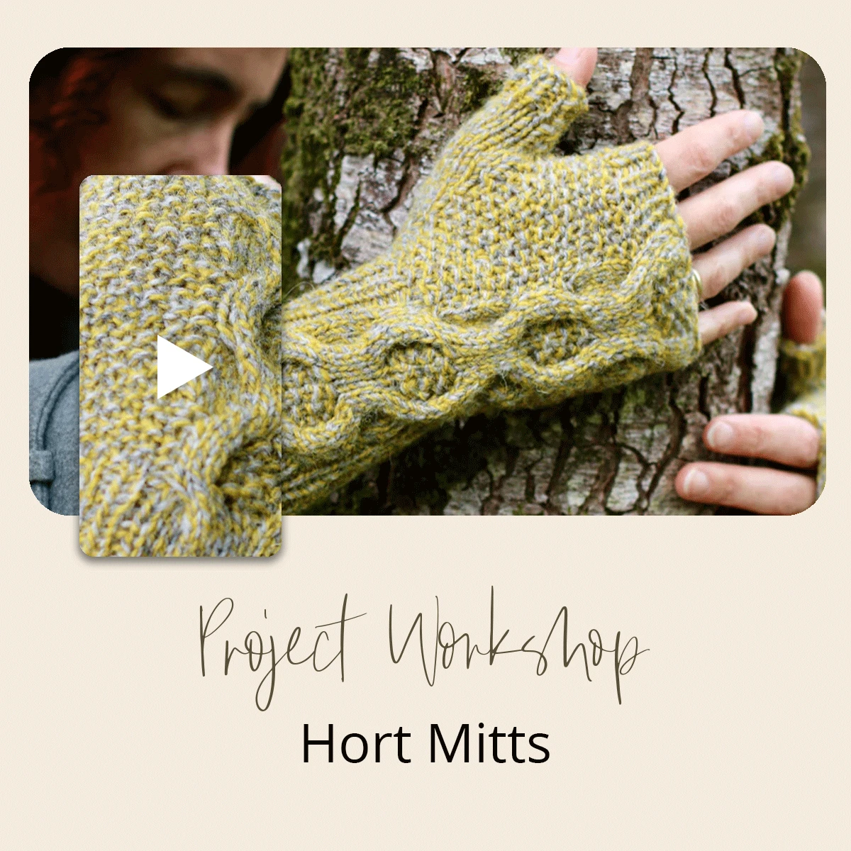 Join Carol Feller in this step-by-step video class. Learn how to knit both versions of the Hort Mitts with her in your choice of fingerless or flip top. Worked in Moss Stitch with a delicate Moss Stitch Medallion cable worked along the outer edge of each mitt.