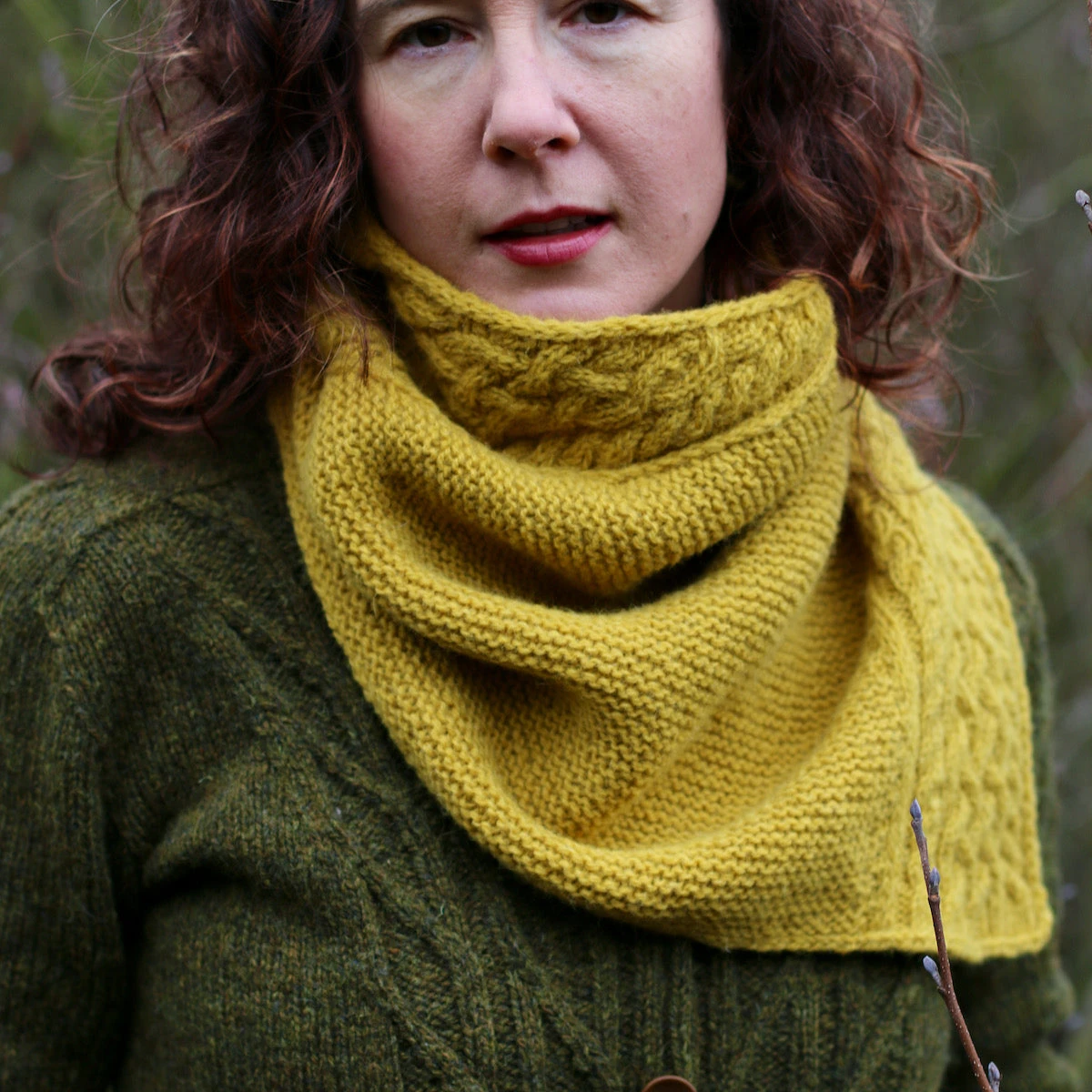 Join Carol Feller in this step-by-step video class. Taisce (Irish for treasure or hoard) is a large cowl shaped to imitate the coverage of a triangular shawl about the neck. It features a cabled panel, which hangs diagonally, against a background of cosy garter stitch. Designed by Eimear Earley.