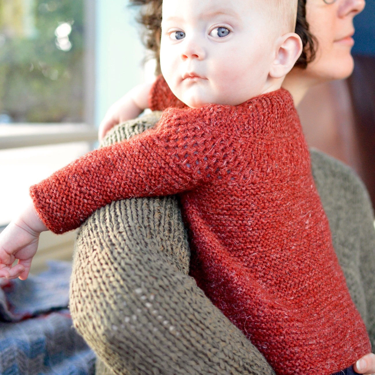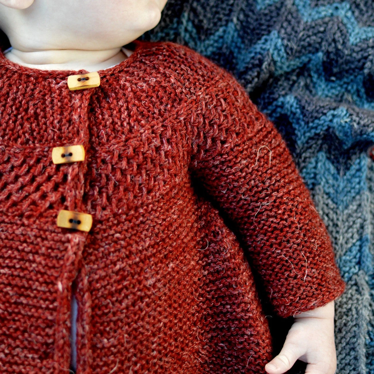 Simple lines and a cute a-line flair make this cardigan a fun knit and great for kids to wear. Knit in two directions; work the short row yoke from side to side and then work the body downwards. A unique finishing touch is added using a short row hem curve. A junior version of the very popular Ravi pattern.