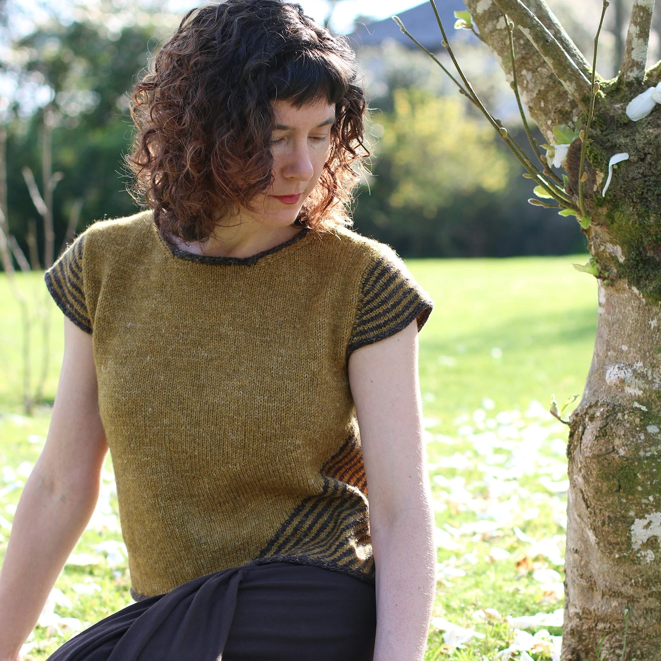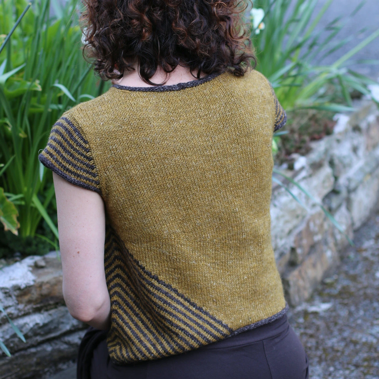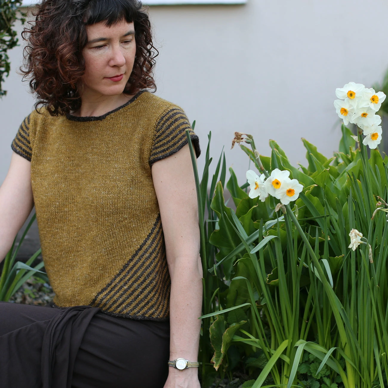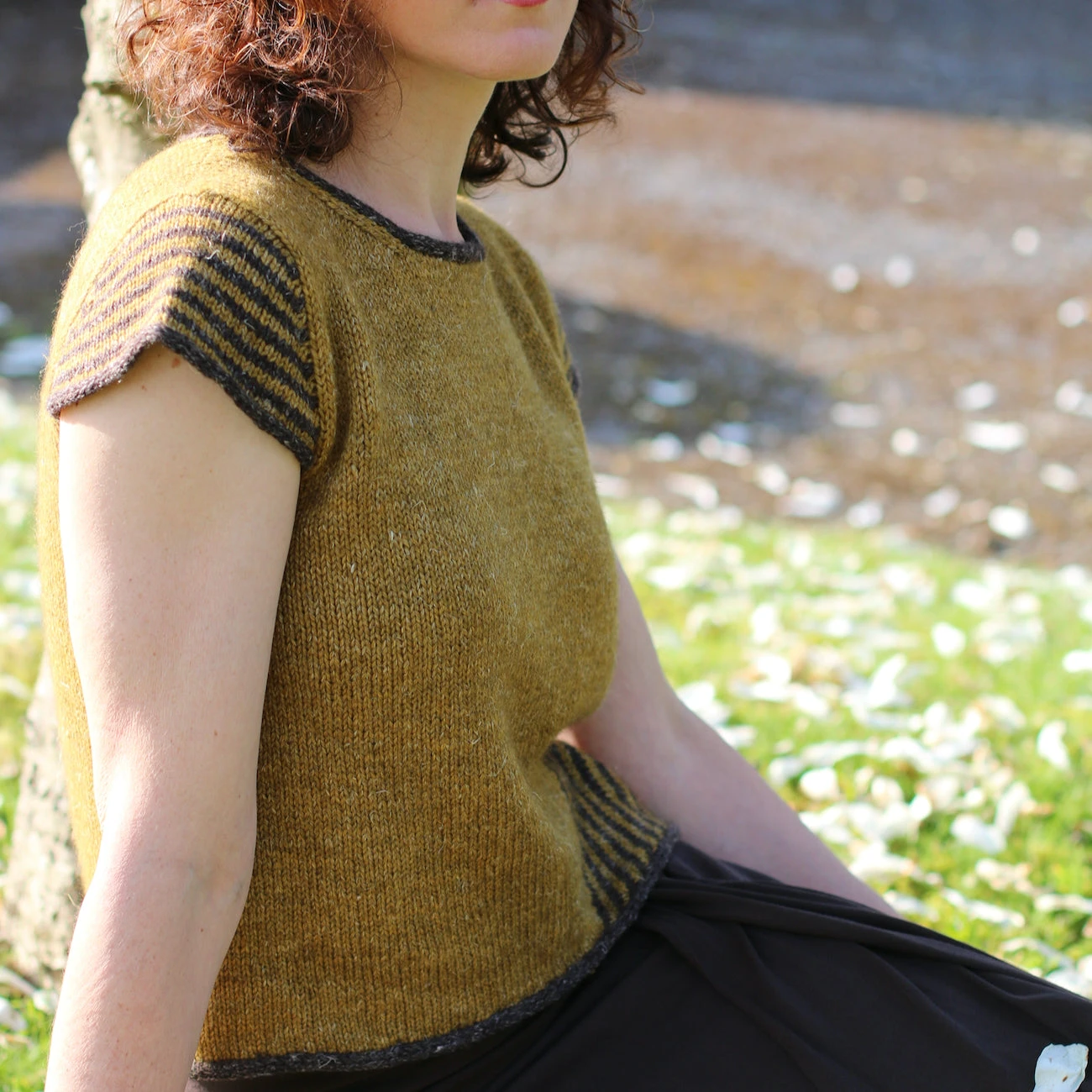 Knit from the bottom up, first with increases in stripes and then using short rows. The shoulders are joined using a 3-needle bind-off and the striped cap-sleeves are shaped with short rows.
