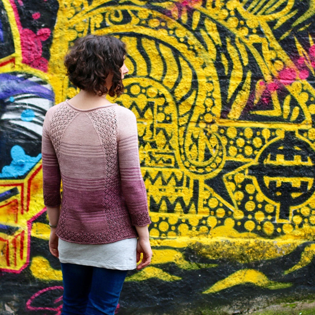 Knit from the top down, this delicate lace cardigan has wide lace panels that travel from the neck down the length of the cardigan. There are 2 yarn options given; either a gradient version where the yarn color moves from light to dark, creating a lovely ombre or a single colour version in Nua.