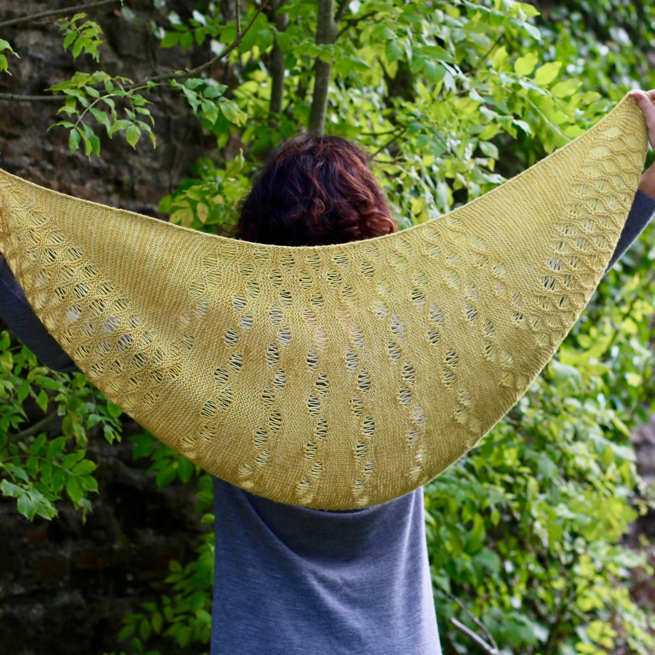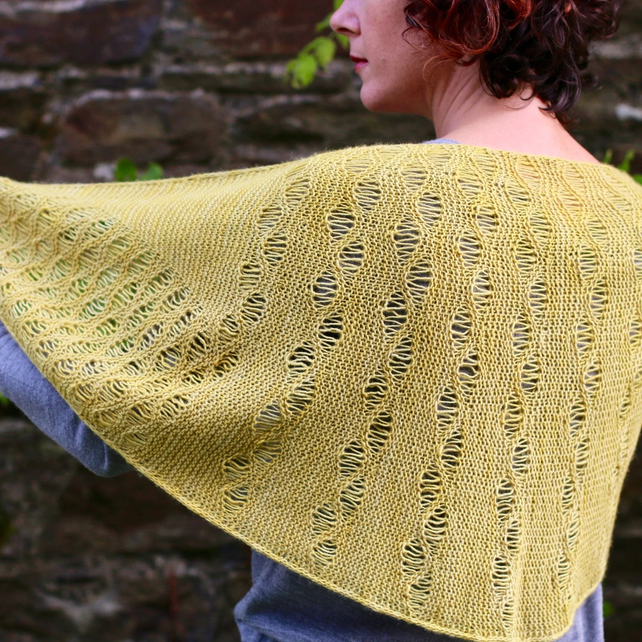 The delicate undulating effect of the Seafoam pattern creates a beautiful open fabric. This shawl is light and delicate, with an easy-to-memorise pattern. It is knit from one side, starting with increases, moving on to short rows to shape the centre and finishing with decreases at the other side.