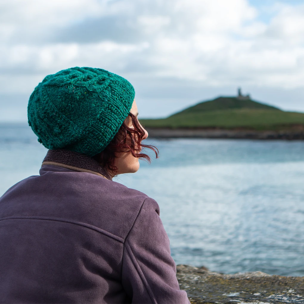Worked in our Deas yarn, a rustic woollen spun aran, this set embodies its Irish island design theme, from the cables inspired by windswept cliffs and wave columns inspired by the sea.