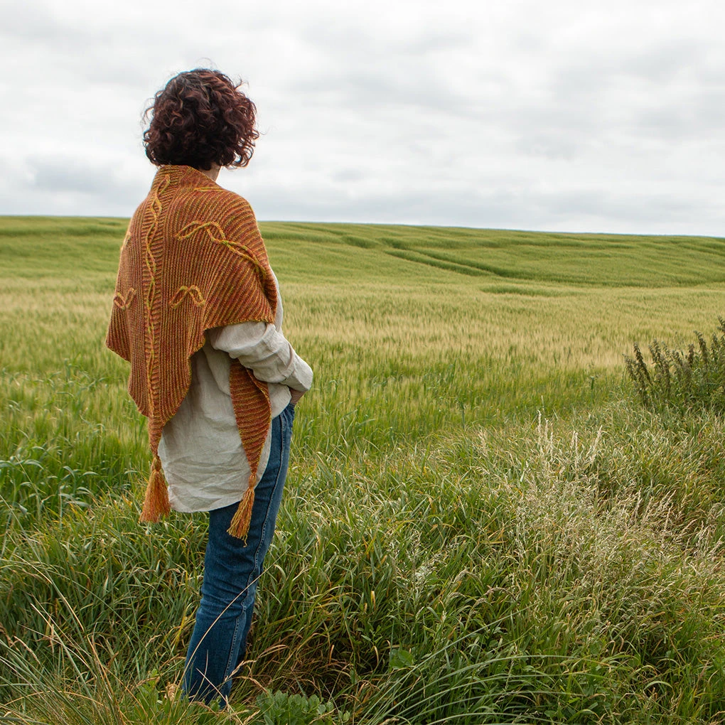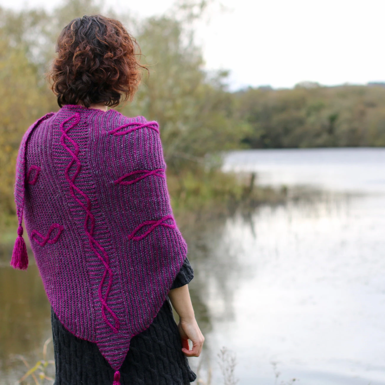 A beautiful shawl that uses a unique double garter stitch background over which a single colour cable seems to float!