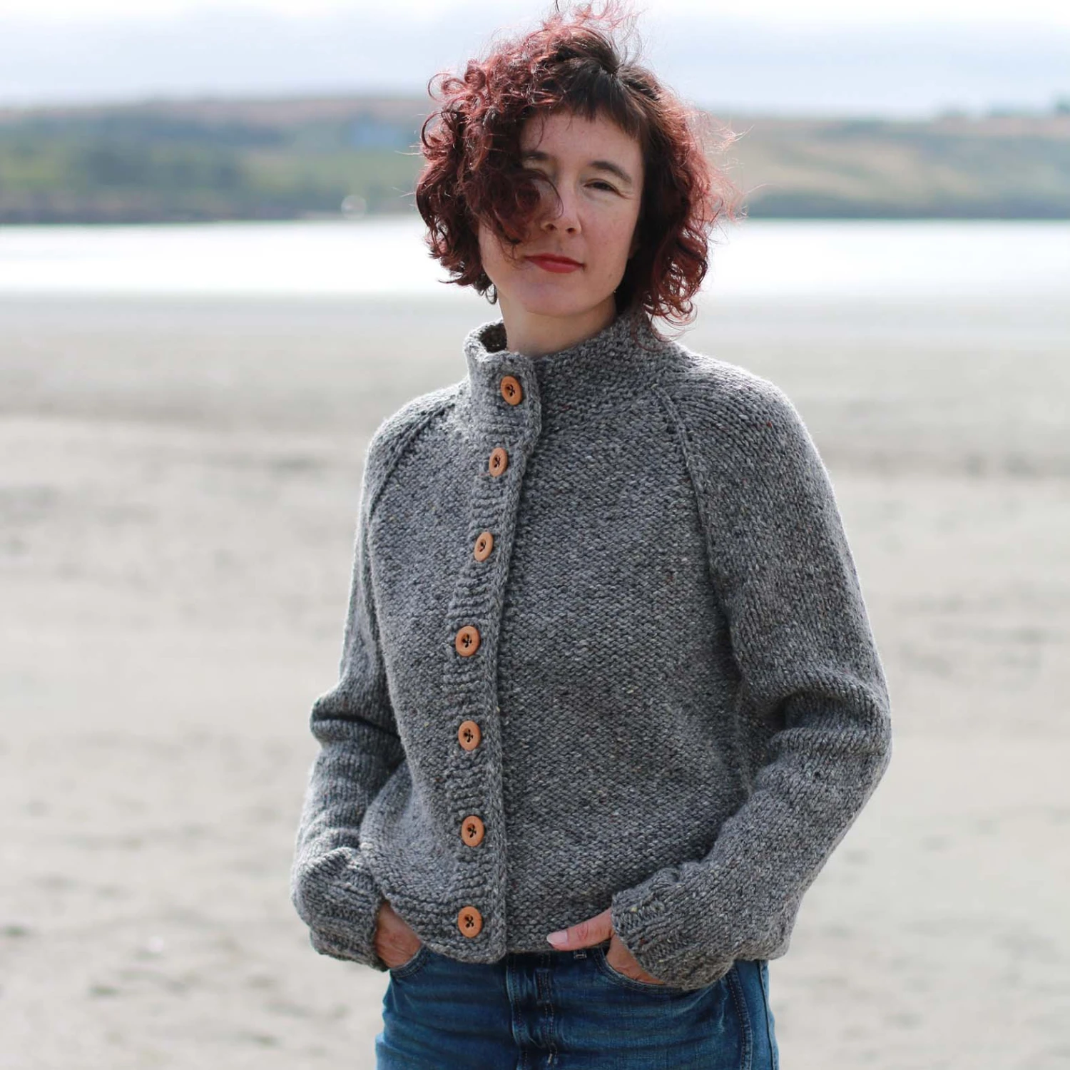 Worked from the top down with seamless raglan shaping, it has a shorter body and a high neck collar. The body of this cardigan is worked in a combination of reverse stockinette stitch and ribbing. This contrasts with the sleeves, which are worked in stockinette stitch.