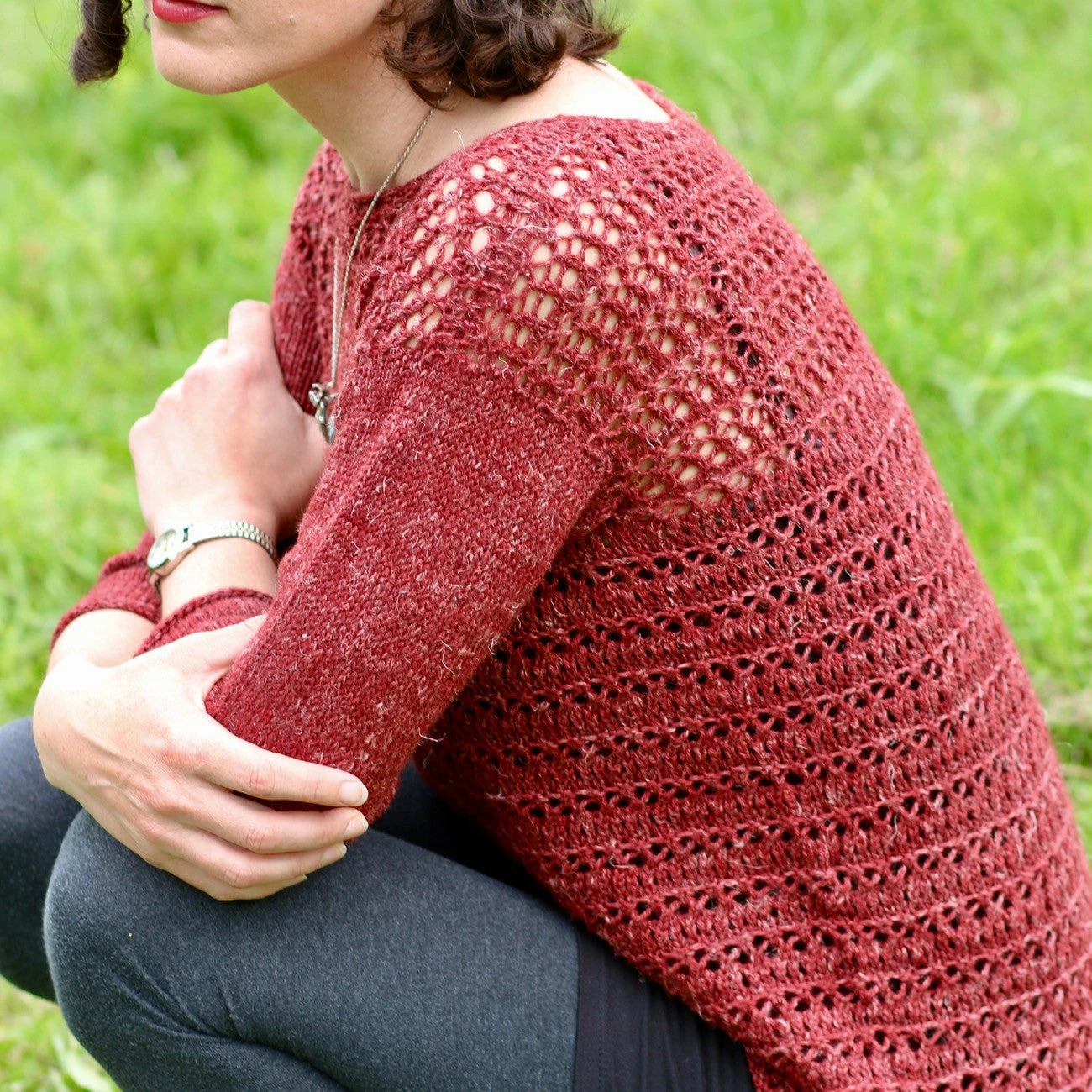 Celebrate the coming of warm weather with a lightweight fun sweater. Loose fitting with delicate lace stripes, it’s perfect for over that pretty spring dress. Knit in the round from the bottom up, the body splits at the yoke and the front and back are worked separately. Sleeves are picked up from the armhole and worked in the round to the cuff.