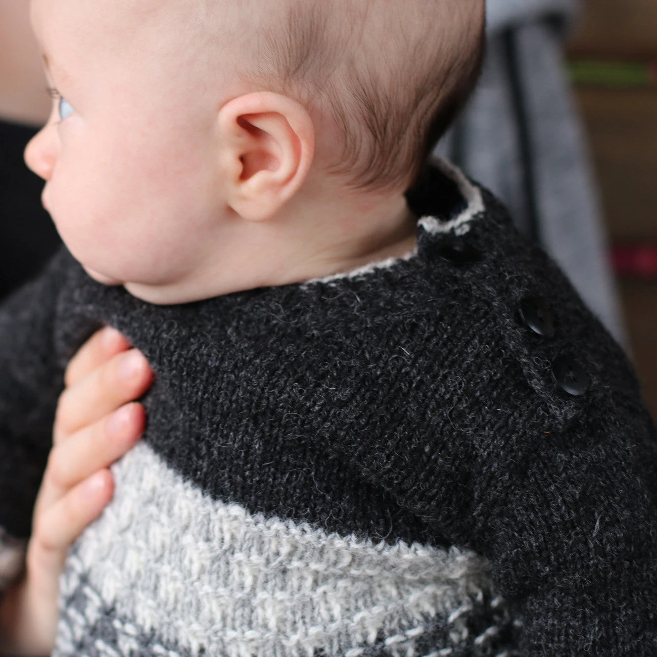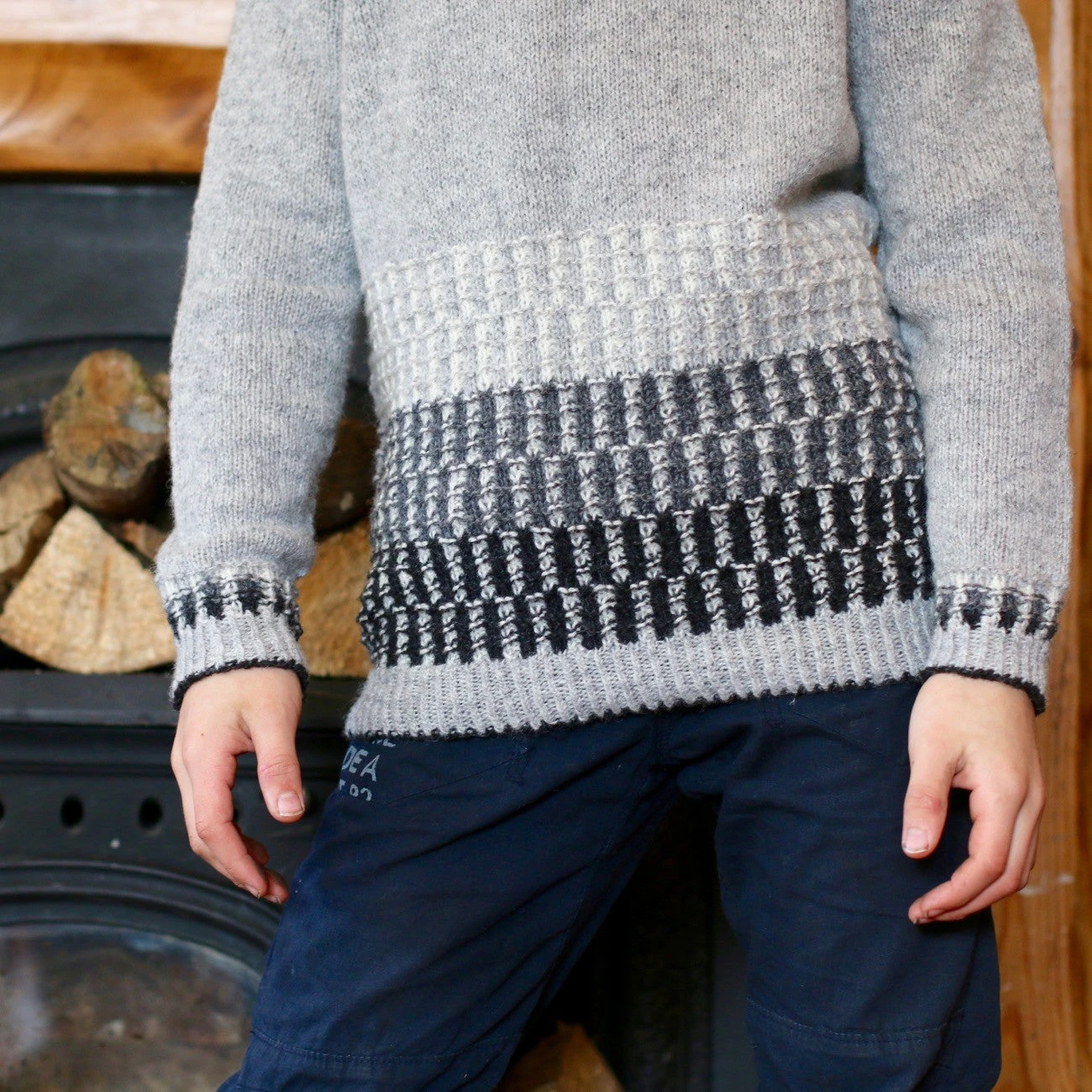 Create your own subtle or dramatic colour gradients with this sweater. This sweater uses a simple stranded colourwork pattern for the body that allows you to blend seamlessly from one colour to the next. Keep it as subtle as in the sample or go for some crazy colour changes for your child!