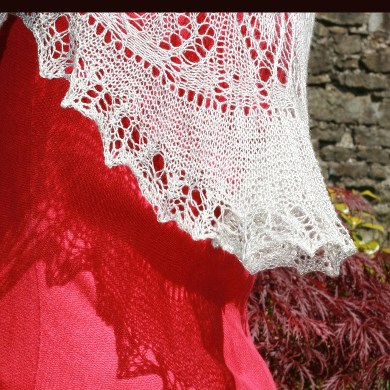 The delicate effect of lace weight yarn is hard to resist. However if you don’t wear shawls this shrug makes a great alternative. Worked as a rectangle of lace, sleeves are grafted together and the edging around the body of the shrug is worked directly from the remaining stitches. For added impact a garter stitch short-row ruffle is worked at the back of the shrug and scalloped edging is worked around the opening.