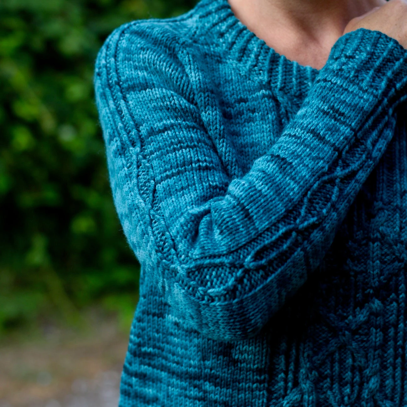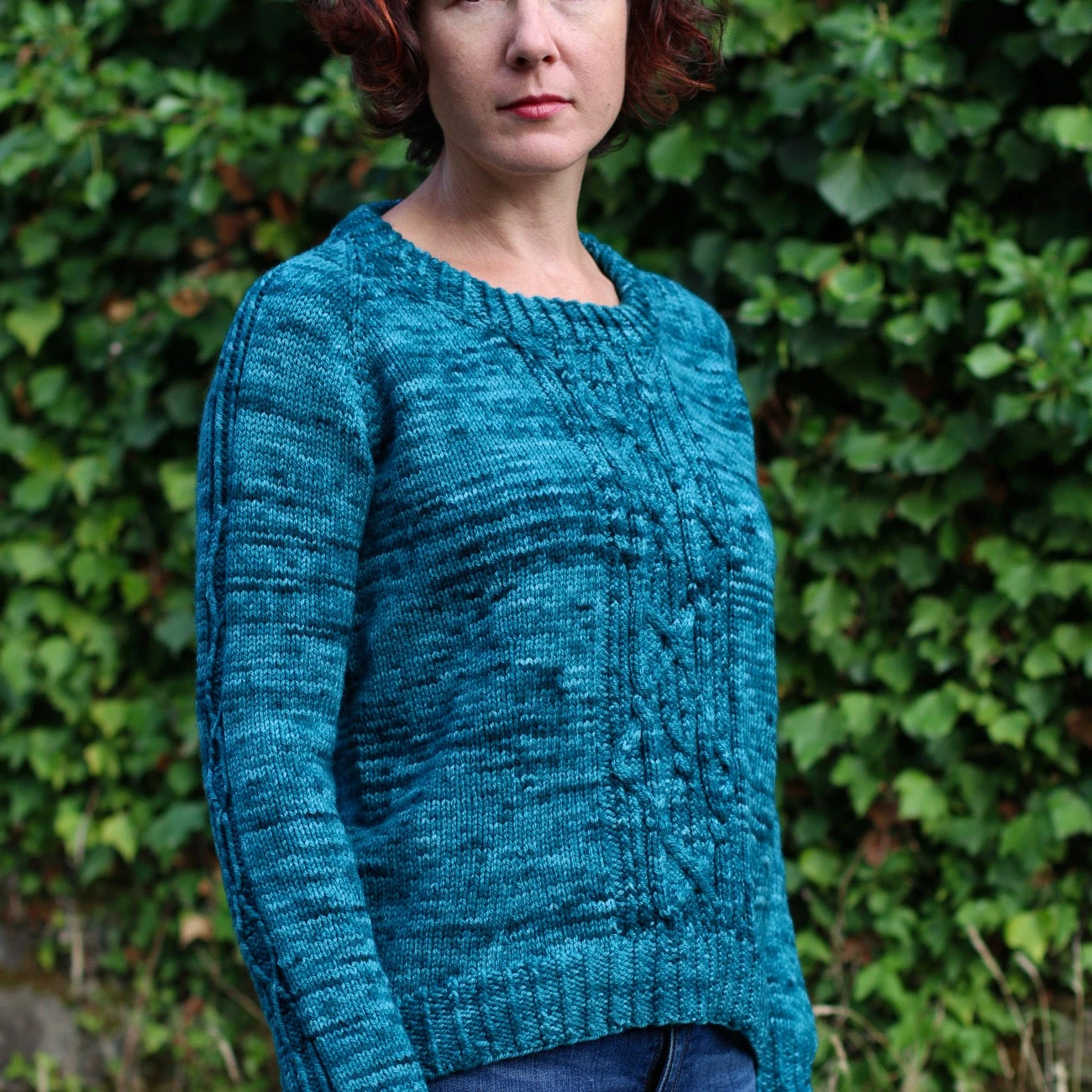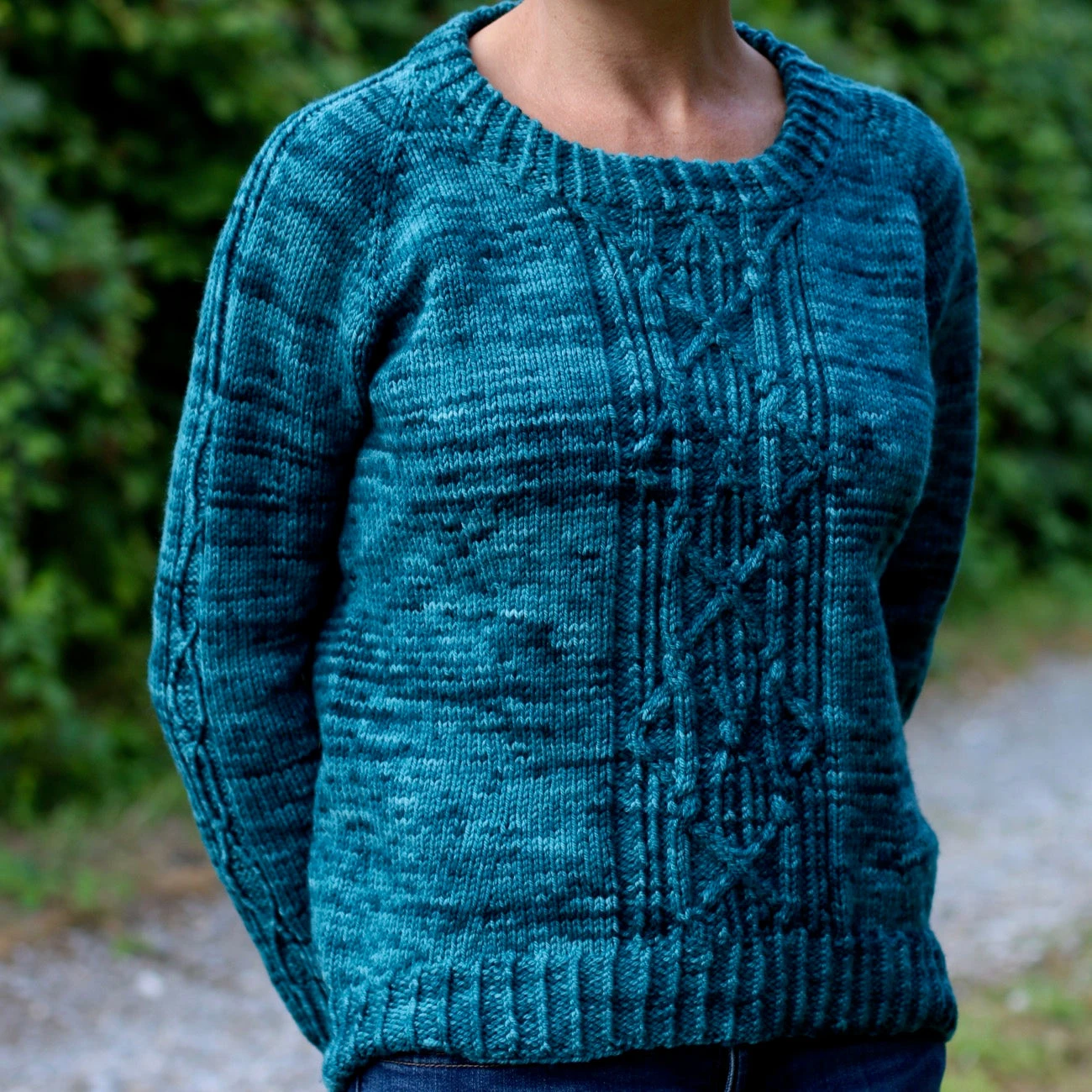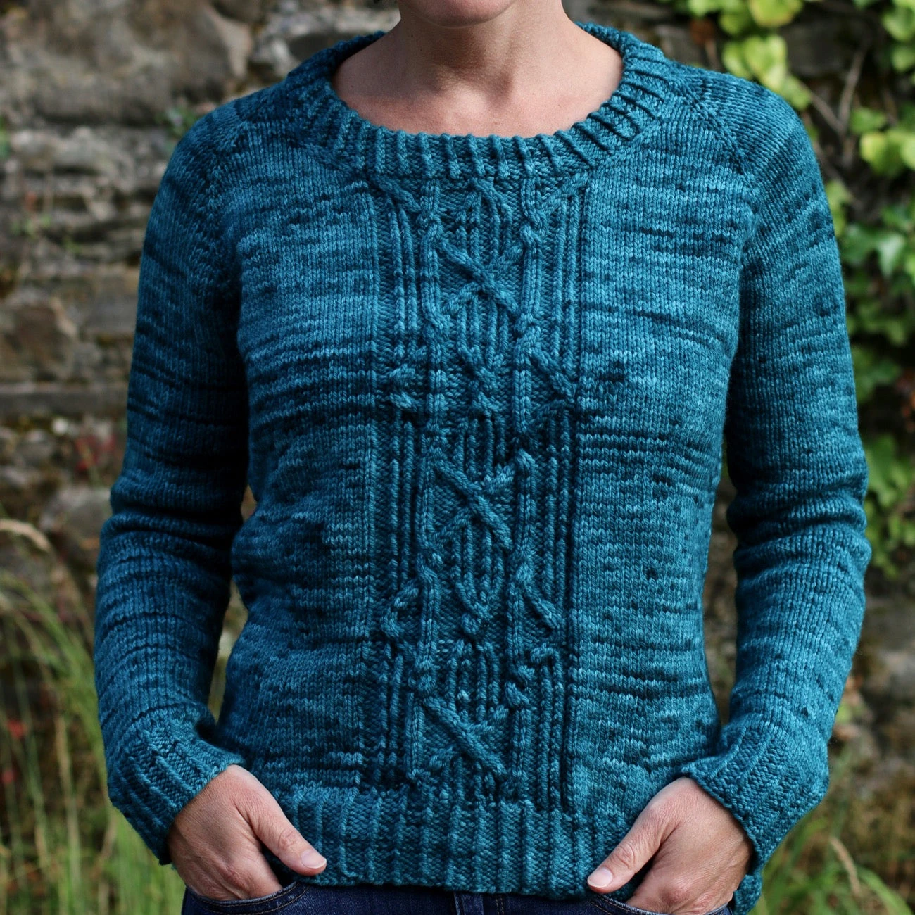 This cosy winter sweater is comfortable to wear, and the cables are fun to knit! Worked from the top down with raglan shoulder shaping there is a delicate twisted stitch cable along the front and a twisted stitch sleeve cable. The hem has a gentle curve along the back created with short rows.