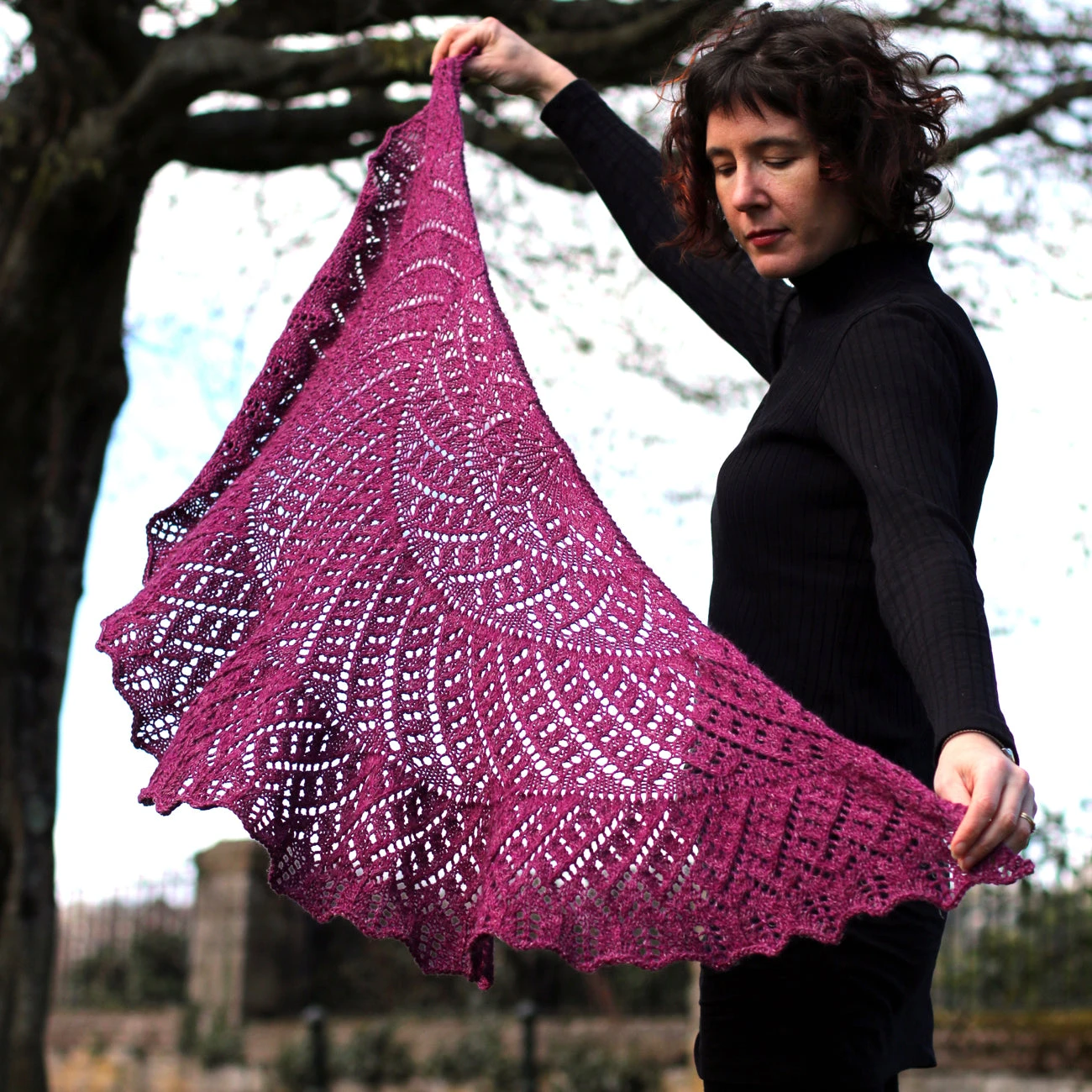 This semi-circular shawl is knit from the neck down with increase rows becoming spaced further apart as you move down the shawl.