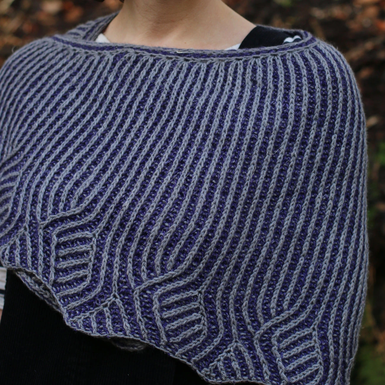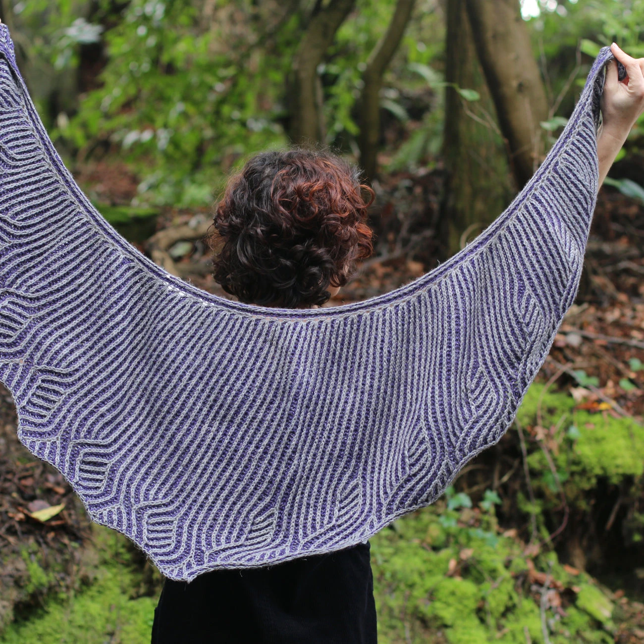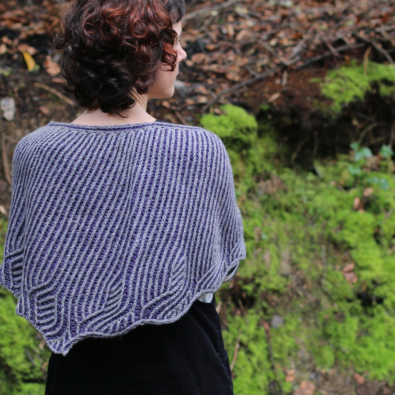 Increases and decreases in Brioche naturally create beautiful lines and textures. This shawl uses a simple increase and decrease pattern along the bottom edge to create an elegant flowing shawl.