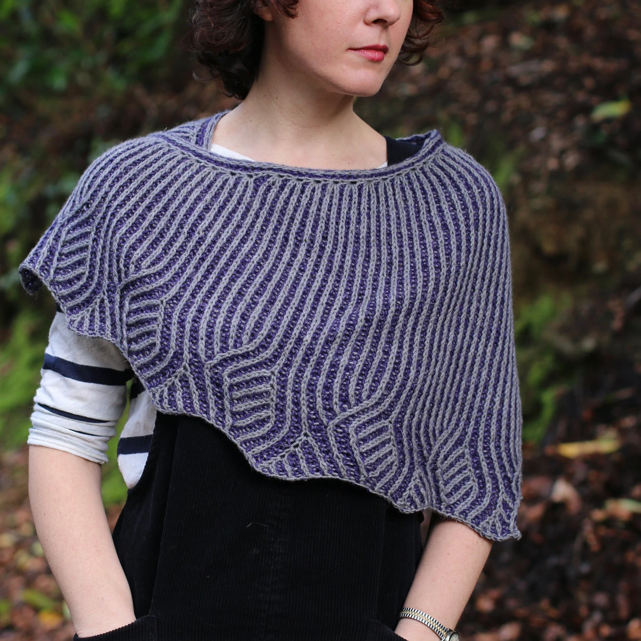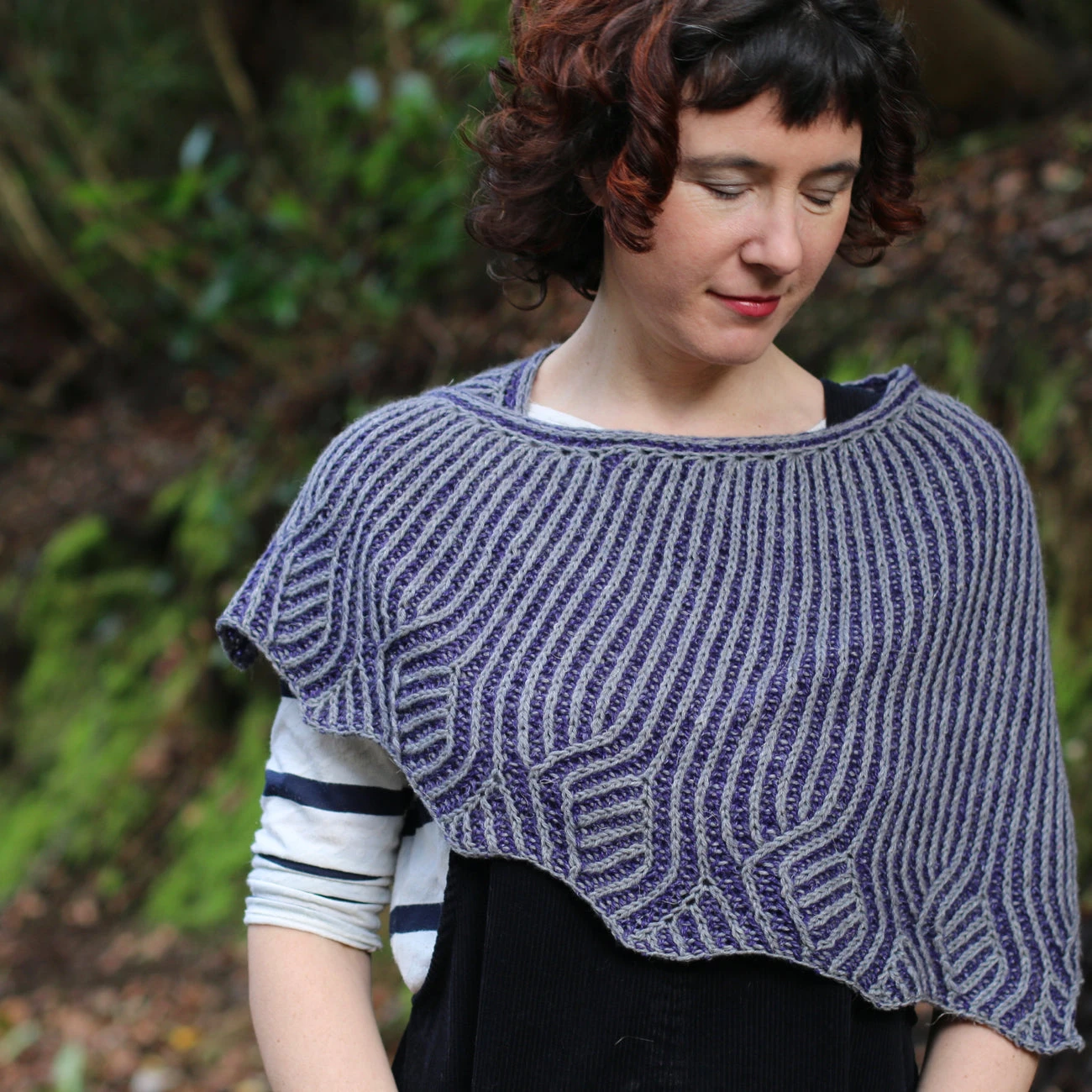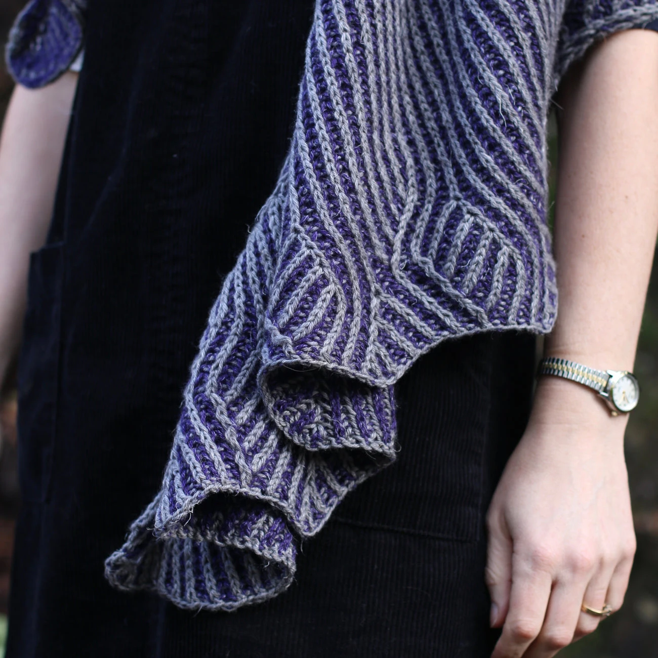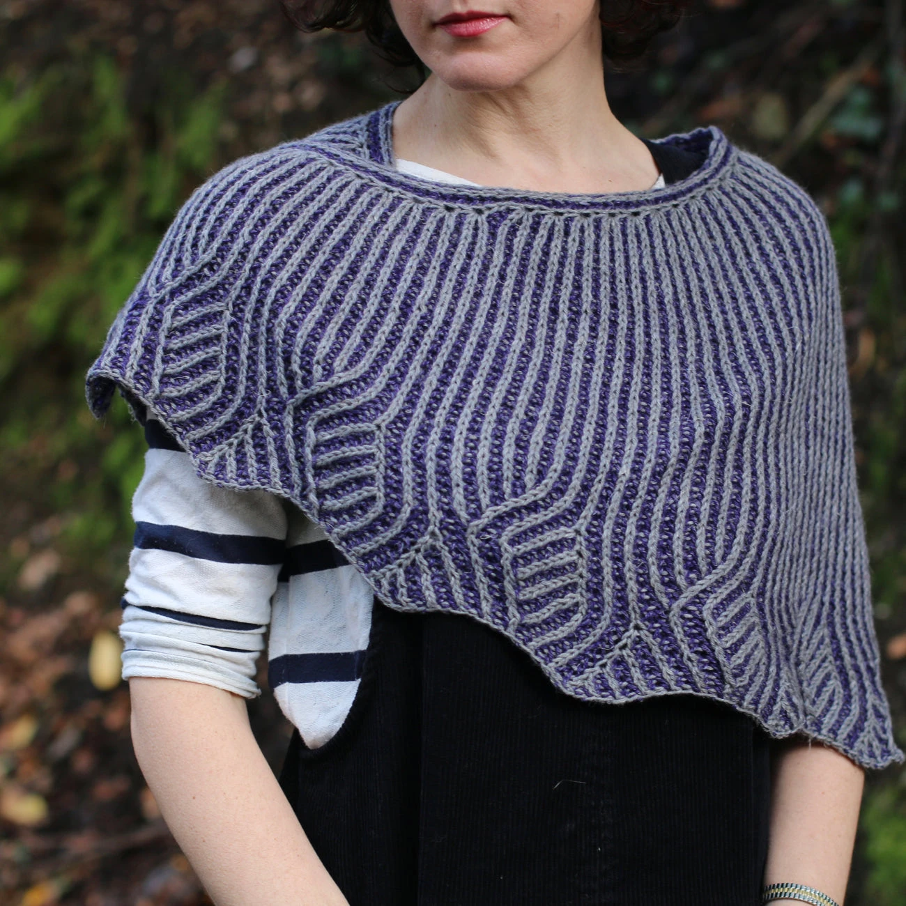 Increases and decreases in Brioche naturally create beautiful lines and textures. This shawl uses a simple increase and decrease pattern along the bottom edge to create an elegant flowing shawl.